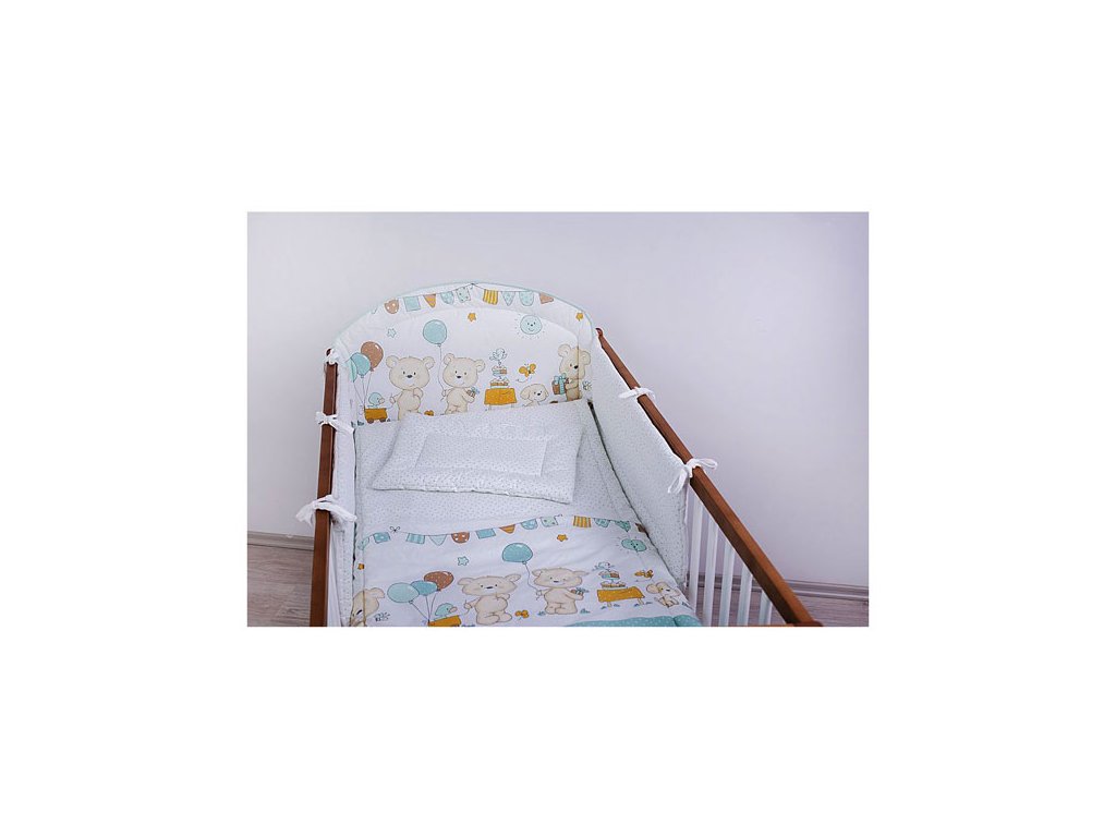 Das Set beinhaltet: ein Kissen (40 x 60 cm), eine Bettdecke (100 x 135 cm) und einen Nestchen (ca. 200 x 25 cm).