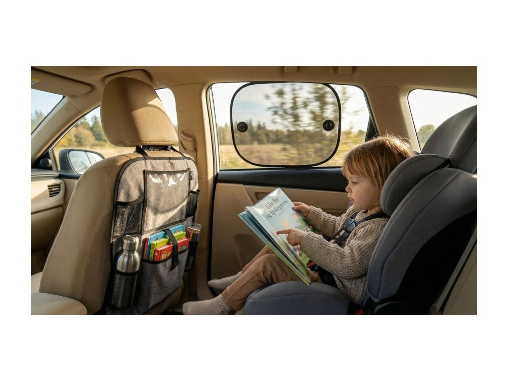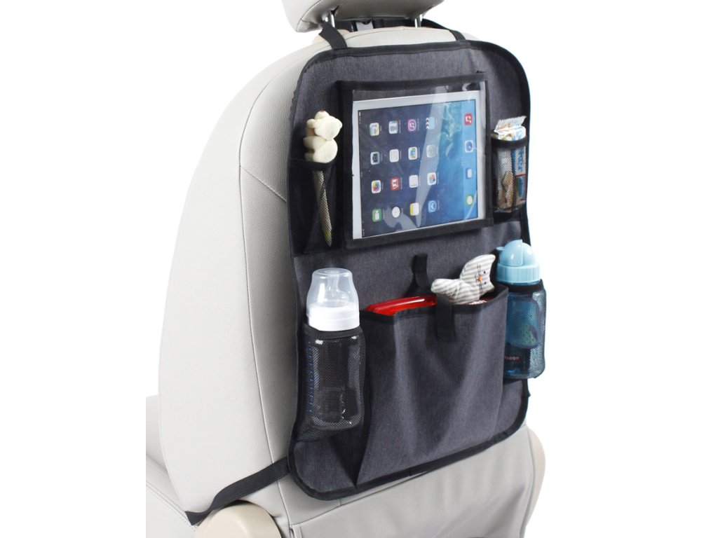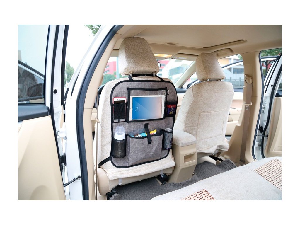 Universaltasche auf der Rückseite des Vordersitzes, ausgestattet mit sieben Taschen, darunter zwei Getränkehalter. Diese Tasche schützt die Rückseite des Vordersitzes vor Schmutz und bietet gleichzeitig Platz für Spielzeug, Bücher und andere Notwendigkeiten der hinten sitzenden Passagiere. Außerdem verfügt es über eine große Tasche zur Aufbewahrung aller gängigen Tablet-Größen sowie eine Tasche für ein Mobiltelefon. Das Material des Einstecktuchs ist pflegeleicht und wasserfest. Der obere Teil der Tasche wird mit Riemen um die Kopfstütze befestigt, im unteren Teil wird sie mit einem Riemen um den gesamten Sitz befestigt. Bei Nichtgebrauch können Sie es einfach zusammenfalten und in der Tasche des Sitzbezugs verstauen. Merkmale: Extra lang und breit, schützt die Rückseite des Sitzes gut vor Tritten und schmutzigen Schuhen. 7 Taschen, darunter eine transparente für ein Tablet und einen Telefonhalter. Ermöglicht die Verwendung eines Touchscreens und die Oberflächenreinigung. Hat zwei Getränkeflaschenhalter. Es ist hergestellt aus wasserdichtem Stoff, schützt und reinigt gut.< /p>