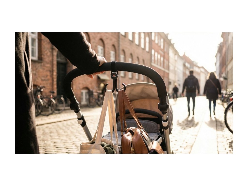 Fehlt Ihrer Wickeltasche eine Befestigungsmöglichkeit am Kinderwagen? Möchten Sie Ihre Lieblingshandtasche weiterhin mit dem Kinderwagen nutzen? Gefällt Ihnen Ihre Handtasche, aber sie lässt sich nicht am Kinderwagen befestigen? Dann probieren Sie die universellen Doppelhaken von Babydan. Sie sind die perfekte Lösung, um Ihre Tasche am Kinderwagen zu befestigen. Die Befestigung erfolgt einfach mit Klettverschlüssen. Die Haken sind doppelt und die einzelnen Teile drehbar.
