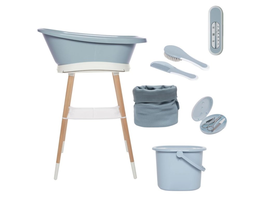 Das Set beinhaltet: die Babybadewanne Sense mit luxuriösem Gestell aus lackiertem Buchenholz, einen Windeleimer, ein Maniküre-Set, Kamm und Bürste, ein Badewannenthermometer und einen hübschen Stoffkorb für Babyartikel. Alles ist im Set enthalten!