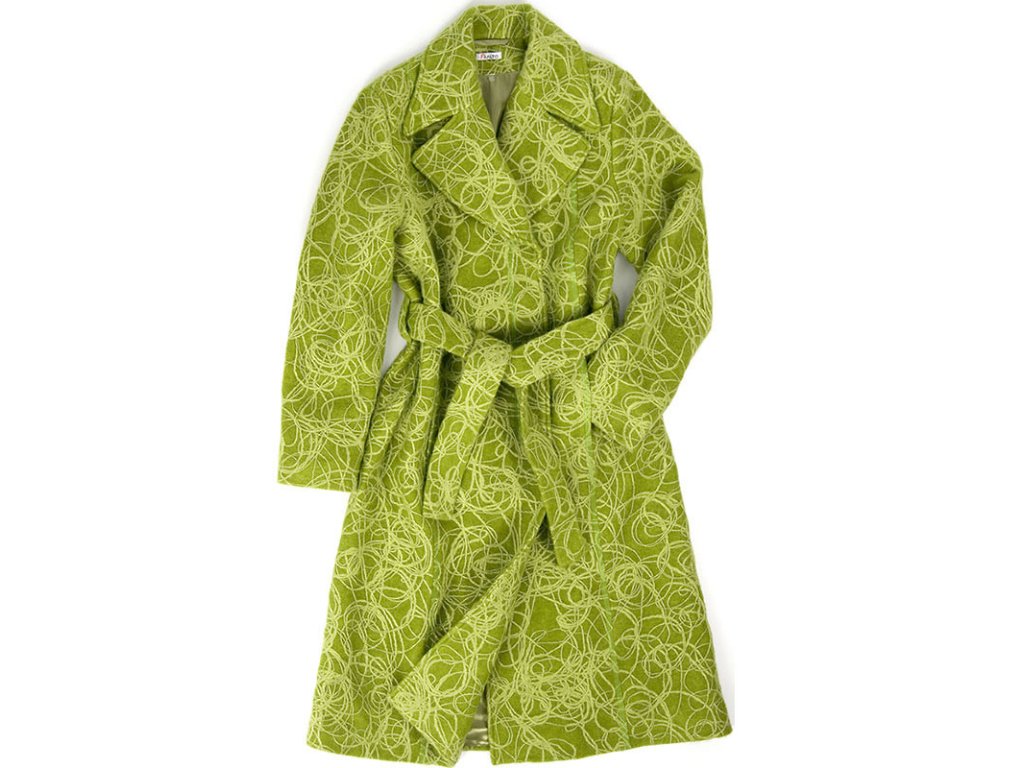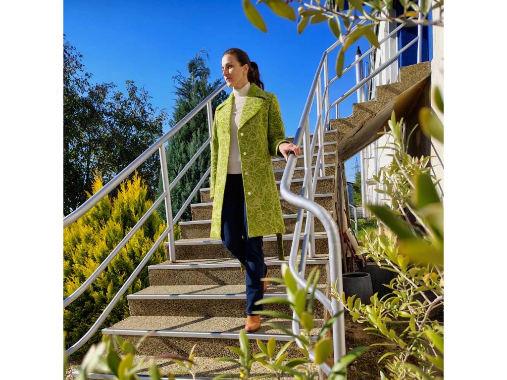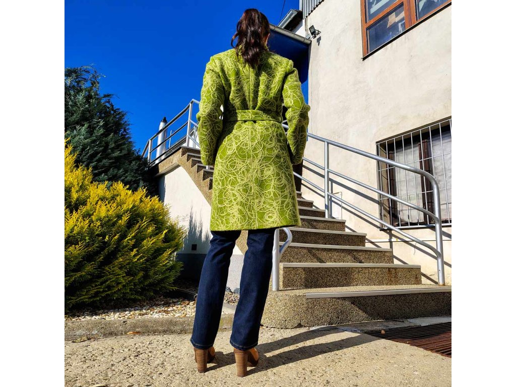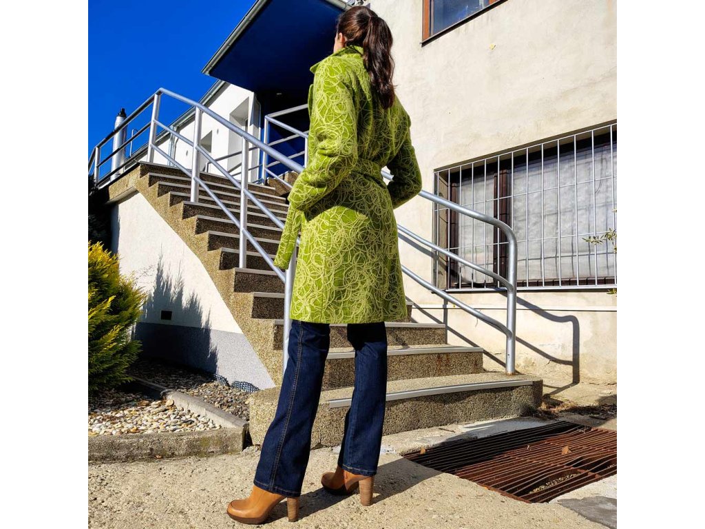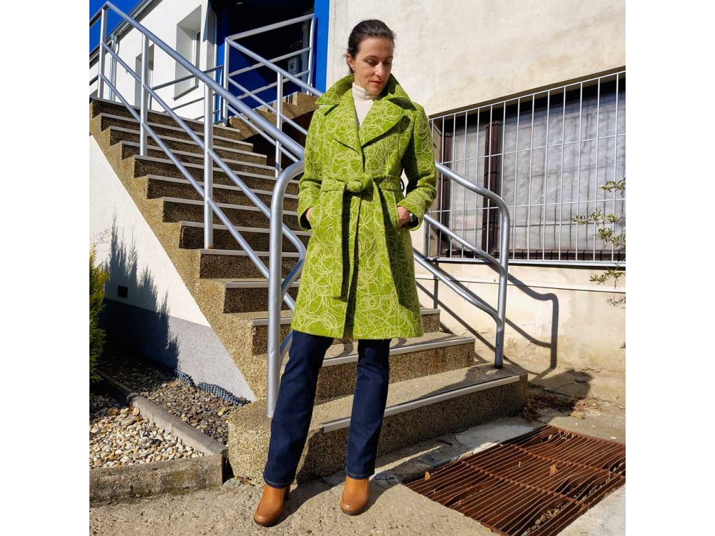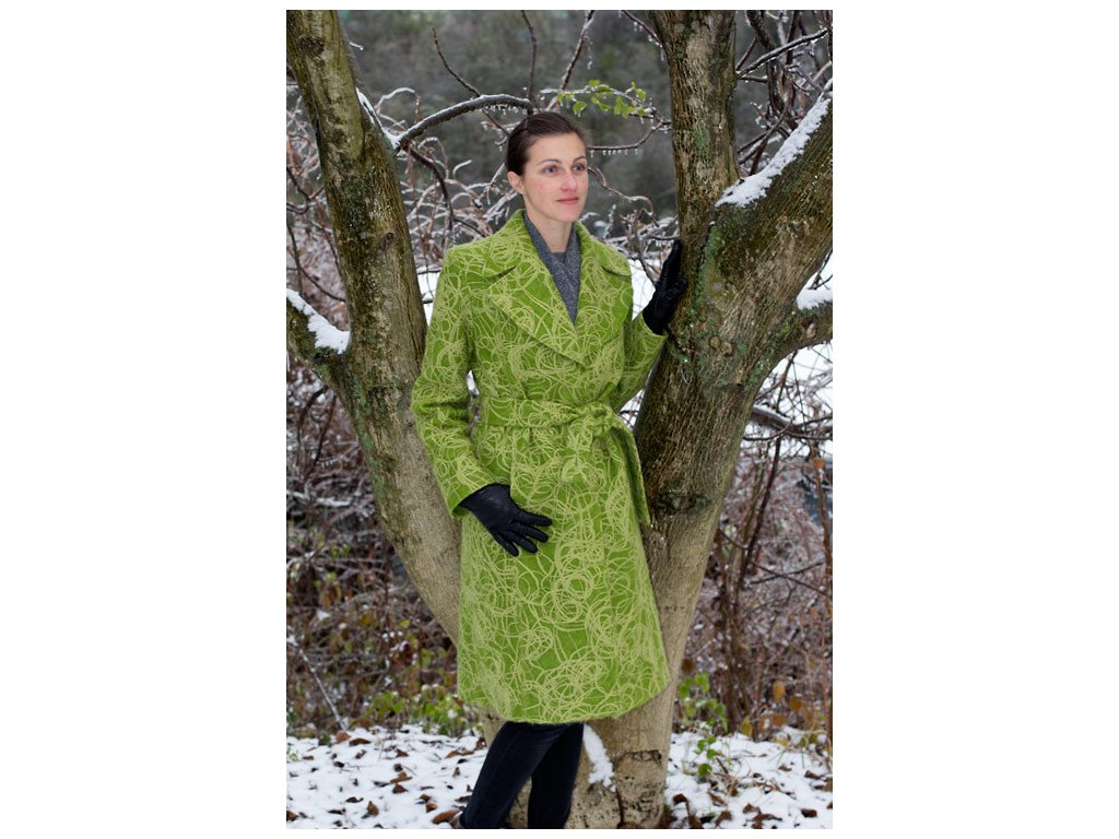 Eleganter grüner Damen-Wollmantel mit markantem Schnitt, verdecktem Magnetverschluss, Eingrifftaschen in den vorderen Seitennähten und Taillengürtel. Die Rückenpartie ist mit einer Mittelnaht versehen. Der Mantel ist gefüttert und hat eine Rückenlänge von 100 cm.
