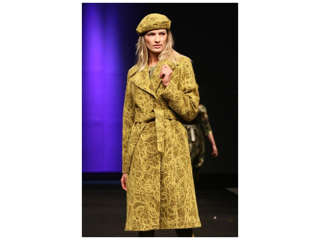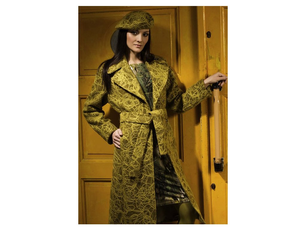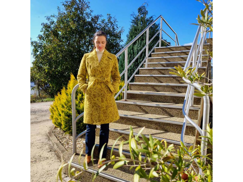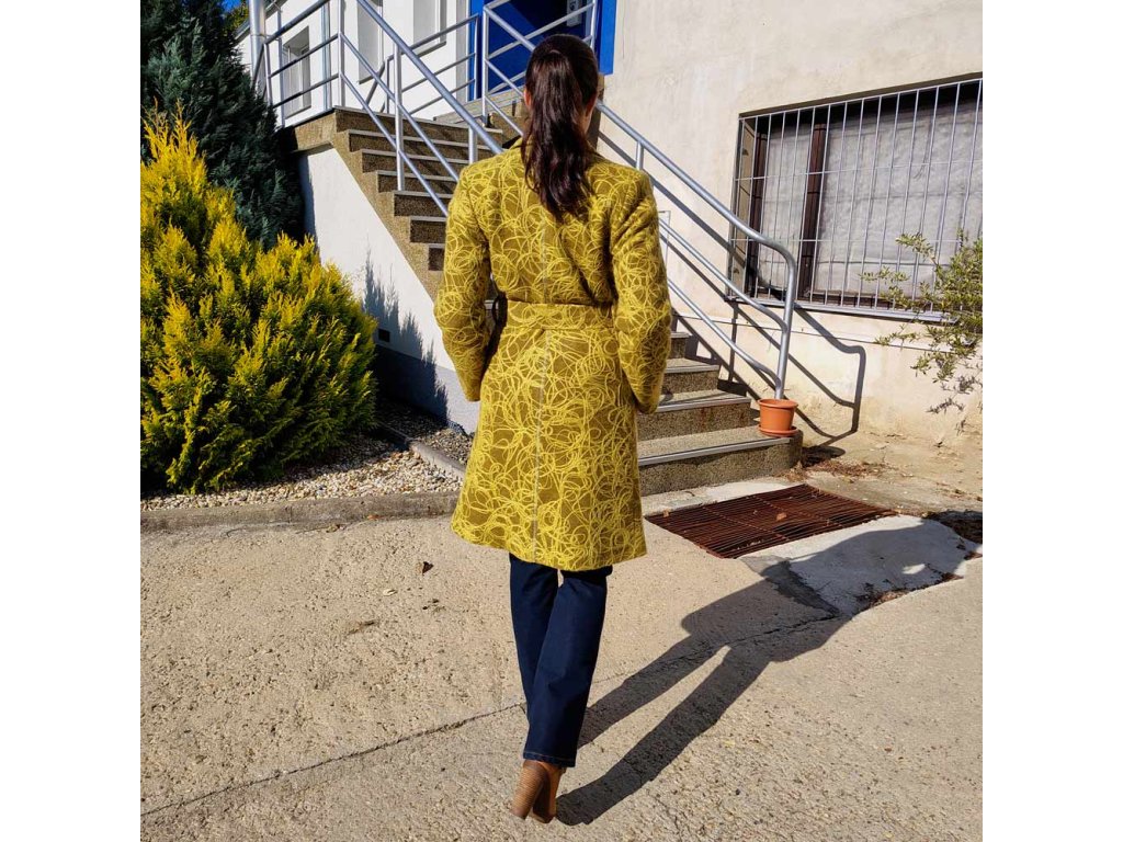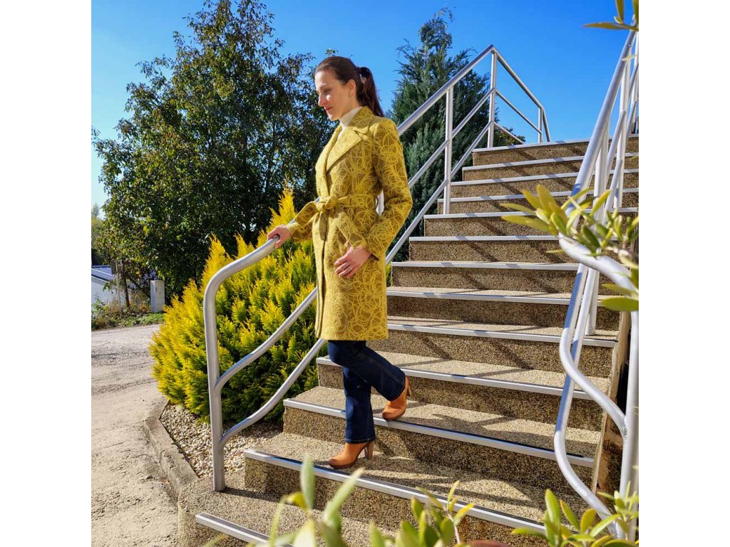 Eleganter Damen-Wollmantel in Senfgelb mit markantem Schnitt, verdecktem Magnetverschluss, Eingrifftaschen in den vorderen Seitennähten und Taillengürtel. Die Rückenpartie ist mit einer Mittelnaht versehen. Der Mantel ist gefüttert und hat eine Rückenlänge von 100 cm.
