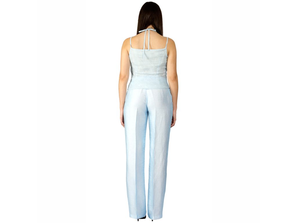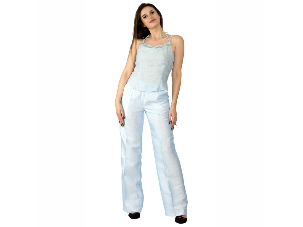 Das schmal geschnittene Partytop für Damen mit schmalen Trägern ist aus leichtem Material in Hellblau mit zartem Kunststoffmuster gefertigt. Die Vorderseite ist mit einem bestickten Perlen-Port verziert. Vorder- und Rückseite sind mit Taillenabnähern geformt. Die unteren Kanten des Tops sind leicht geschwungen. Im Oberteil ist ein BH-Einsatz eingenäht. Ein verdeckter Reißverschluss in der linken Seitennaht erleichtert das An- und Ausziehen.