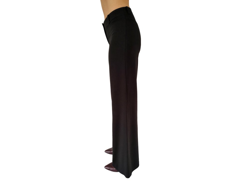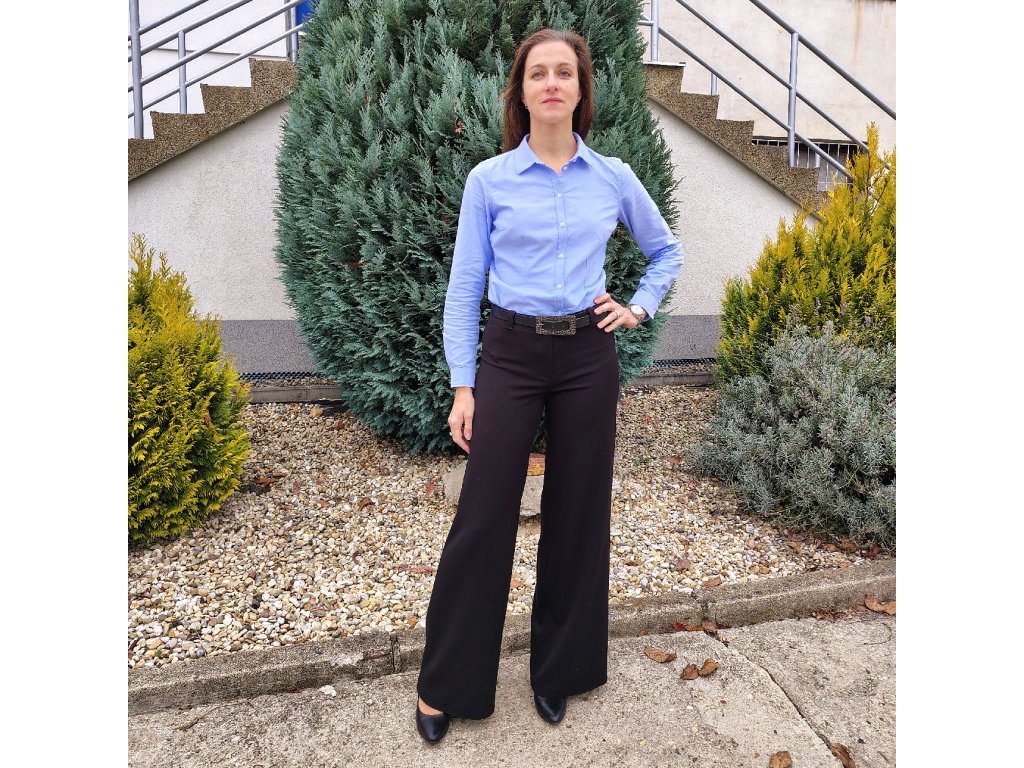 Elegante Damenhose mit modisch weitem Bein. Der Unterschenkelumfang in Größe 38 beträgt 62 cm. Die Hose hat eine bequeme, mittelhohe Taille. Der vordere Teil ist ungeteilt, der hintere Teil ist durch einen Sattel unterteilt. Der Taillenbereich ist mit einem geformten Futter ausgestattet und wird durch sechs Schlaufen ergänzt.