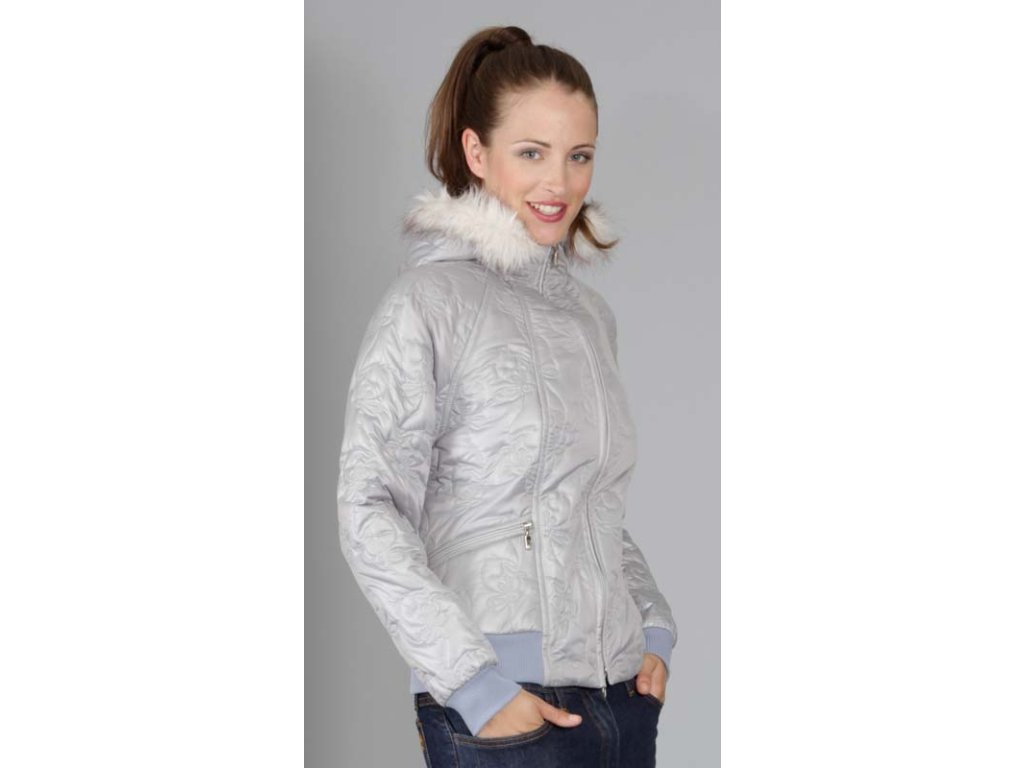 Damen-Reißverschlussjacke aus originell gesticktem Stoff mit Hasenmotiv und Kapuze mit Fellbesatz. Pflegeleicht und maschinenwaschbar.