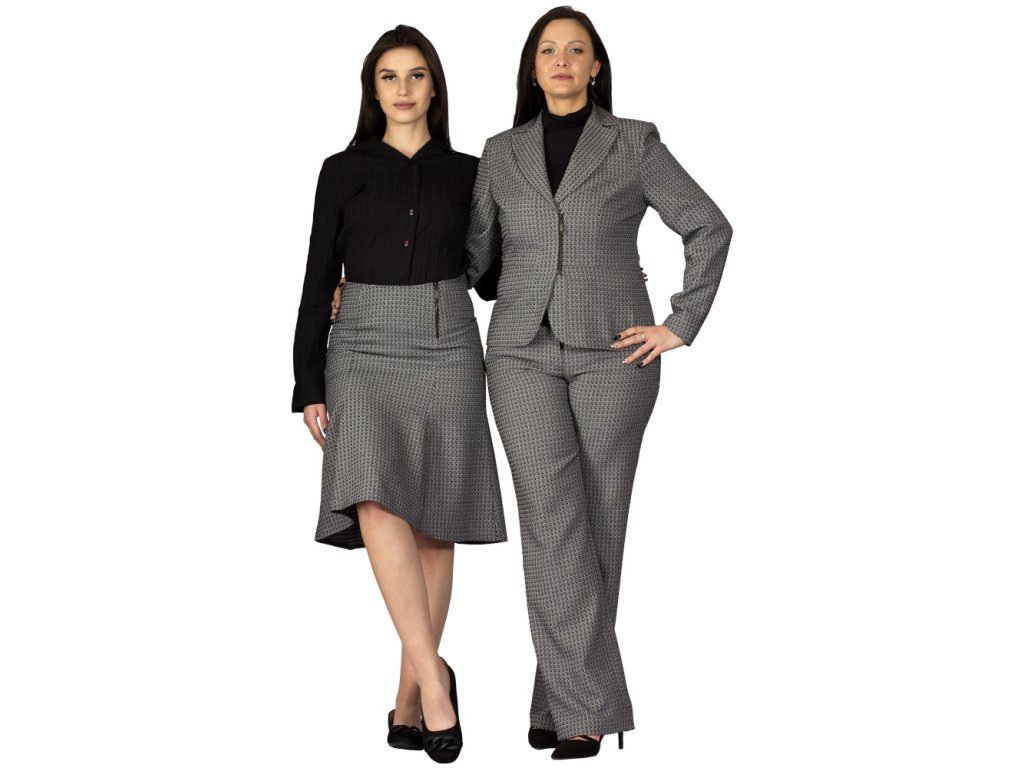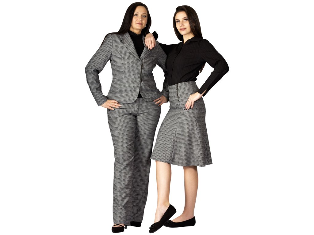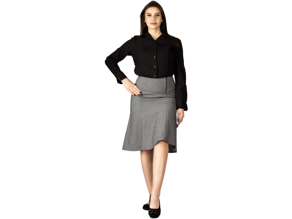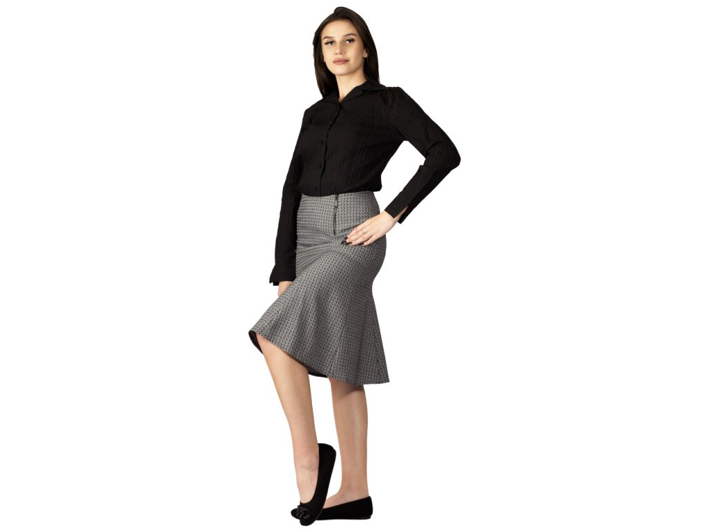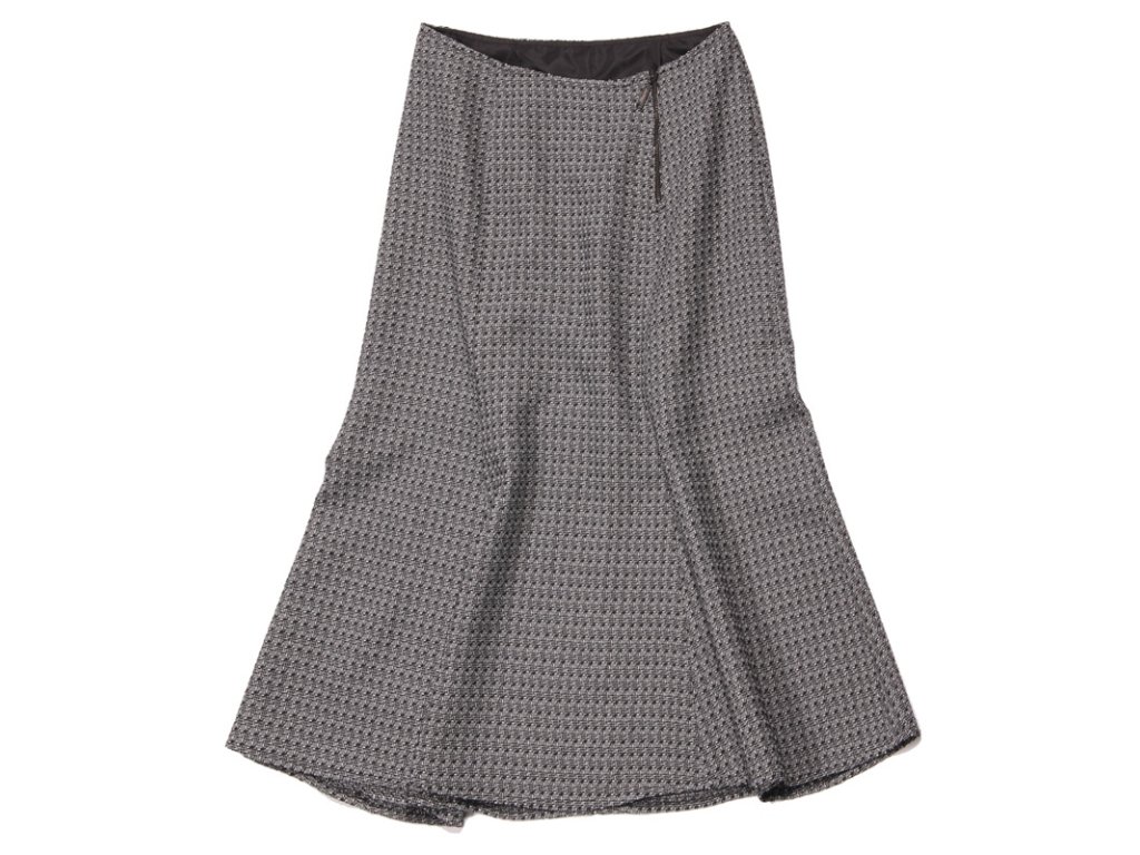 Siebenteiliger, glockenförmiger Damenrock, knielang. Ein dekorativer Metallreißverschluss mit eingenähtem Logo am linken Vorderteil erleichtert das An- und Ausziehen. Der obere Saum ist gefüttert. Das Material besteht aus schwarz-weißem Polyester mit einem Webmuster aus kleinen Quadraten.