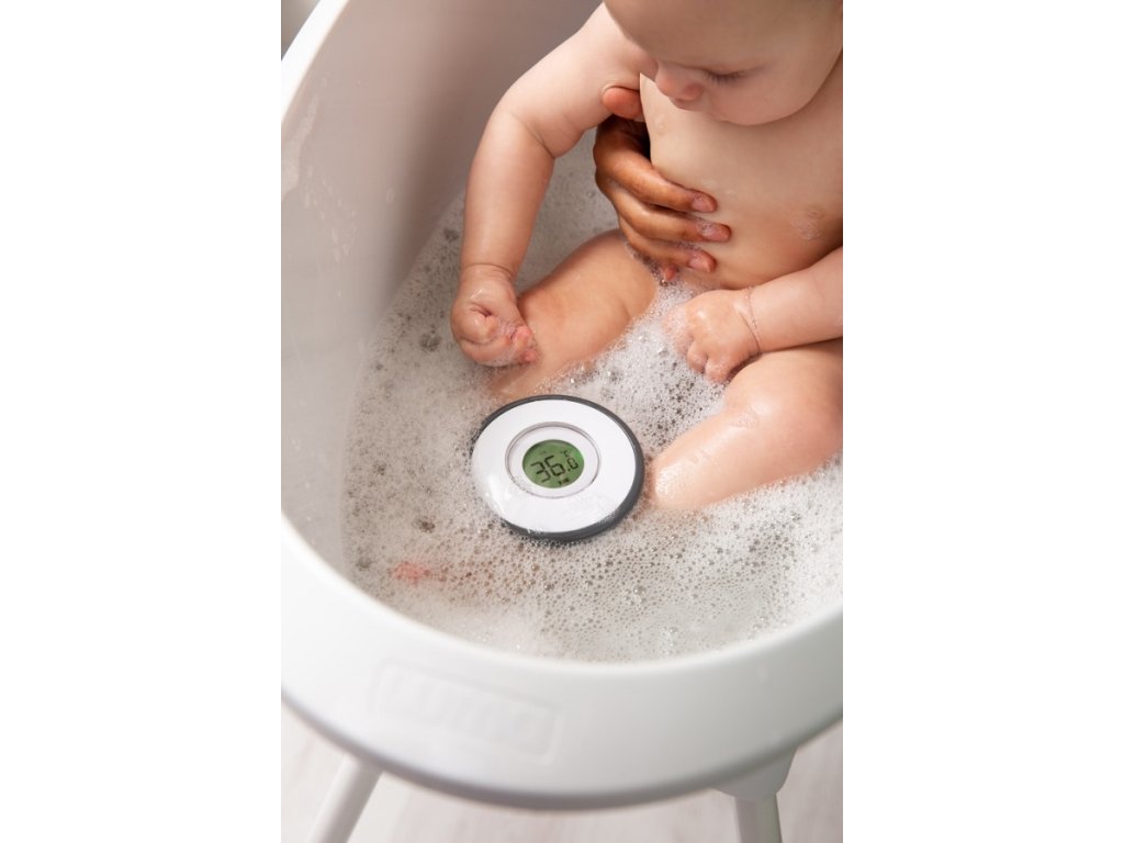 Das digitale Badethermometer von LUMA aktiviert sich automatisch bei Wasserkontakt und schwimmt, sodass die Anzeige zuverlässig ablesbar ist. Blau bedeutet zu kalt, Rot zu warm und Grün genau richtig. Zusätzlich zur Farbanzeige lässt sich die genaue Wassertemperatur ablesen. Außerdem gibt es eine Batteriestandsanzeige auf dem Display. Nach Gebrauch schaltet sich das Thermometer automatisch ab. Du kannst das Thermometer ganz einfach reinigen: Kappe abnehmen, abwischen und schon ist es sauber.