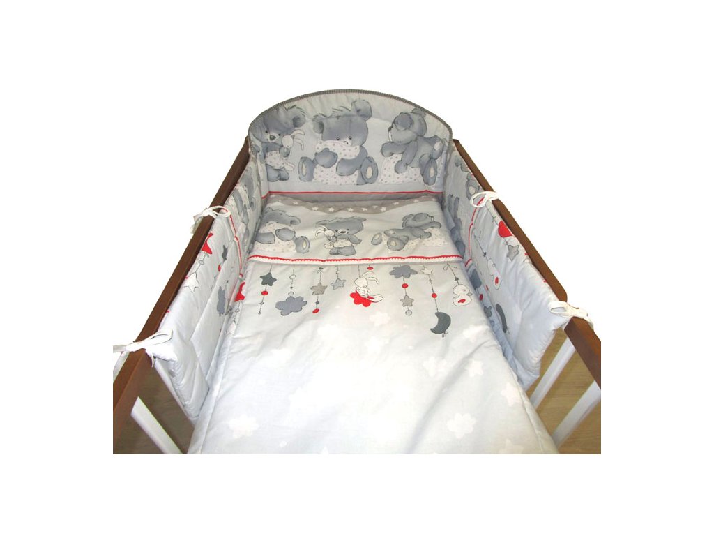 Das Set beinhaltet: ein Kissen (40 x 60 cm), eine Bettdecke (100 x 135 cm) und einen Nestchen (ca. 200 x 25 cm).