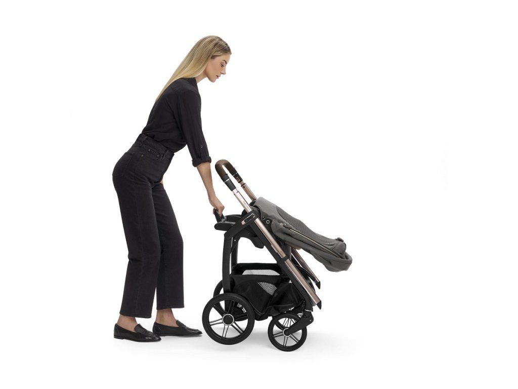 - Der Sitz lässt sich in beide Richtungen einfach am Gestell befestigen und abnehmen. Er lässt sich in beiden Konfigurationen (rückwärts und rückwärtsgerichtet) mit einer Hand auf- und zusammenklappen, auch mit befestigtem Sitz. Zusammengeklappt ist der Kinderwagen extrem kompakt, steht von selbst aufrecht und der Griff berührt nicht den Boden. Dank des Teleskopgriffs, der in vier Positionen höhenverstellbar ist, lässt er sich optimal an die Körpergröße der Eltern anpassen.