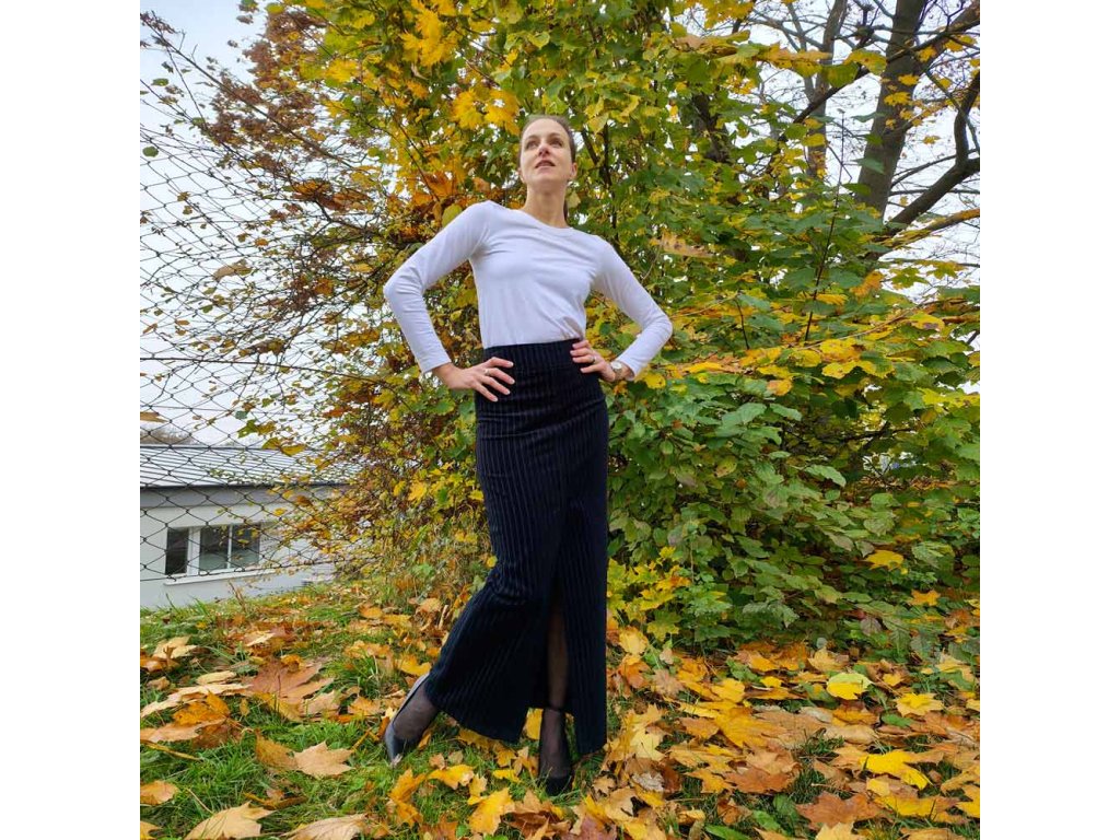 Langer Cordrock für Damen ohne Futter. Die Vorderseite verfügt über einen langen Schlitz, einen Sattel und dekorative Leistentaschen-Imitationen. Die Rückseite ist ebenfalls mit einem Sattel und einem in die Mittelnaht eingenähten Reißverschluss versehen. Die Rückenlänge des Rocks beträgt 105 cm. Er besteht aus Cord mit feinen Streifen.