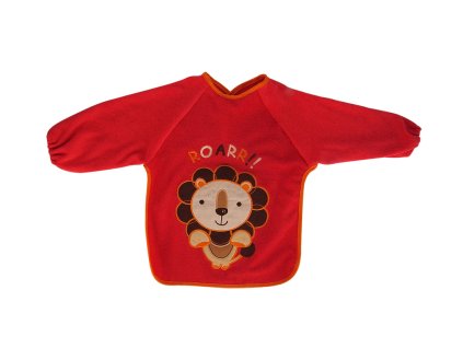 Das rote Lätzchen mit Ärmeln und Löwenmotiv schützt die Kleidung des Säuglings vor Verunreinigungen und entdeckt gleichzeitig den Geschmack und Geruch von Mamas Essen.