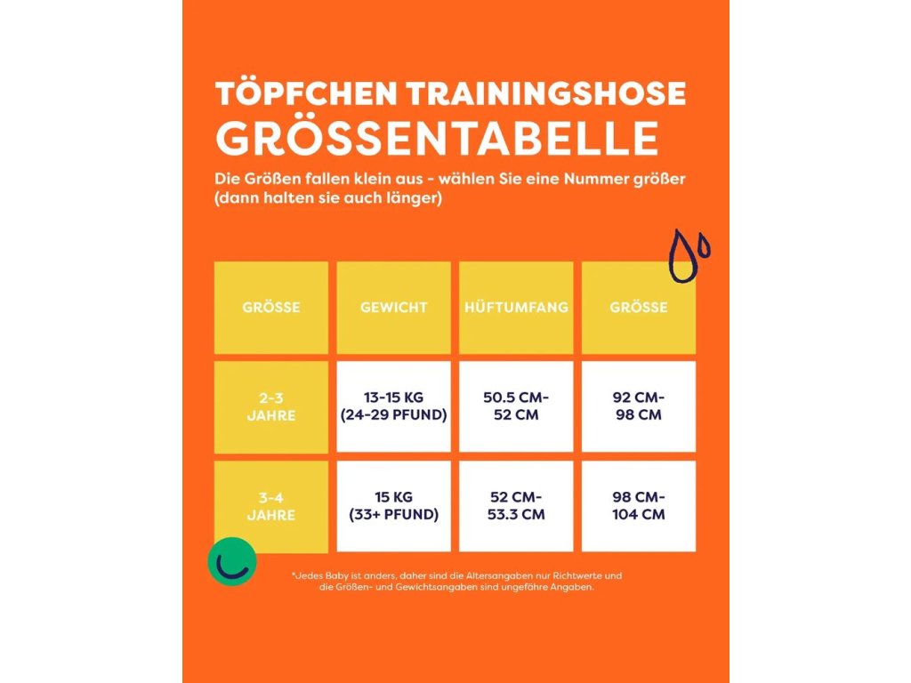 Die undurchlässige Schicht schützt zusammen mit der absorbierenden Schicht teilweise vor Verunreinigungen der Umgebung. Sie helfen, den Lernprozess beim Töpfchen zu beschleunigen, ersetzen aber keine Windeln. Sie können sie Ihrem Baby als Geschenk geben. Sie geben dem Baby das Gefühl, dass es erwachsen ist und keine Windeln mehr braucht. Benutzen Sie sie nicht, bevor das Baby bereit ist, aufs Töpfchen zu gehen. Lernwindeln enthalten zwar eine saugfähige Schicht, die kleinere Mengen Urin auffängt, aber sie ersetzen nicht vollständig eine mehrlagige Windel mit Höschen. Sie sind für das Kind gedacht, das bereits auf das Töpfchen geht und gelegentlich eine unangenehme Episode hat. Im Lernwindelhöschen wird die Nässe sofort gespürt, es kann sich dessen bewusst werden und sich auf das Töpfchen setzen. Ziehen Sie Ihrem Baby die Lernwindeln nicht nachts oder zur Schlafenszeit an, und wenn Sie keine andere Möglichkeit haben, legen Sie eine andere Bambino Mio Mehrlagenwindel hinein, um die Saugfähigkeit zu erhöhen. Waschen Sie die Lernwindeln mindestens zweimal, bevor Sie sie zum ersten Mal benutzen.