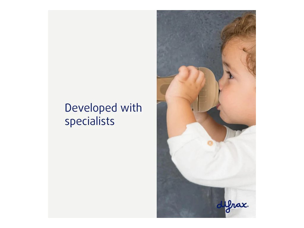 Der patentierte Difrax-Erfrischungsgetränkebecher eignet sich perfekt zum Erlernen des Trinkens aus einem Becher. Es ist ab dem 6. Monat geeignet und erleichtert den Übergang vom Stillen bzw. Füttern aus der Flasche zum Trinken aus der Tasse deutlich. Für das Kind ist es einfach, daraus zu trinken, da es den Kopf nicht wie bei normalen Bechern neigen muss. Es ist mit zwei Griffen zum einfachen Greifen und einem Softdrink ausgestattet. Die Trinkflasche enthält ein einzigartiges Ventil mit der Möglichkeit, den Durchfluss in 2 Stufen einzustellen. Gleichzeitig verhindert das Ventil ein Auslaufen, wenn das Kind nicht trinkt.