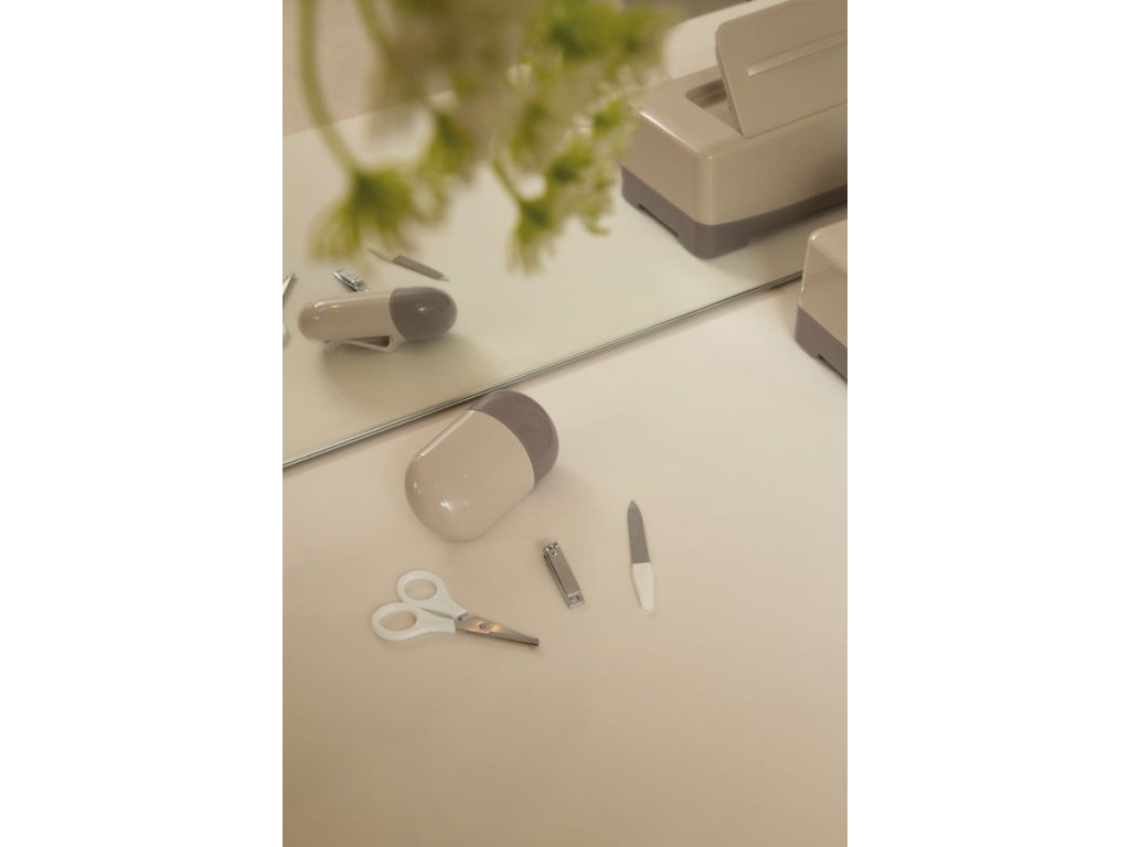 Die Maniküre umfasst eine Schere mit abgerundeten Enden, eine Nagelfeile und eine Nagelzange. Alles ist aus Edelstahl gefertigt. Die Box schützt vor Staub und hilft, die Maniküre sauber zu halten. Reinigen Sie die einzelnen Instrumente jedoch vor jedem Gebrauch sorgfältig und desinfizieren Sie sie bei Neugeborenen mit einer Alkohollösung.