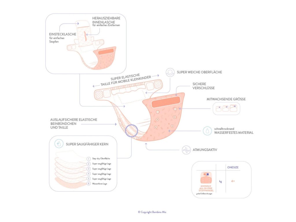 Die preisgekrönte miosolo All-in-One-Windel ist schön weich, stylisch und einfach wie Wegwerfwindeln zu verwenden. Dabei werden neueste Erkenntnisse auf dem Gebiet der textilen Funktionsmaterialien und die langjährige Erfahrung des Herstellers aus der Produktion und dem Vertrieb von Stoffwindeln in 60 Ländern der Welt genutzt.