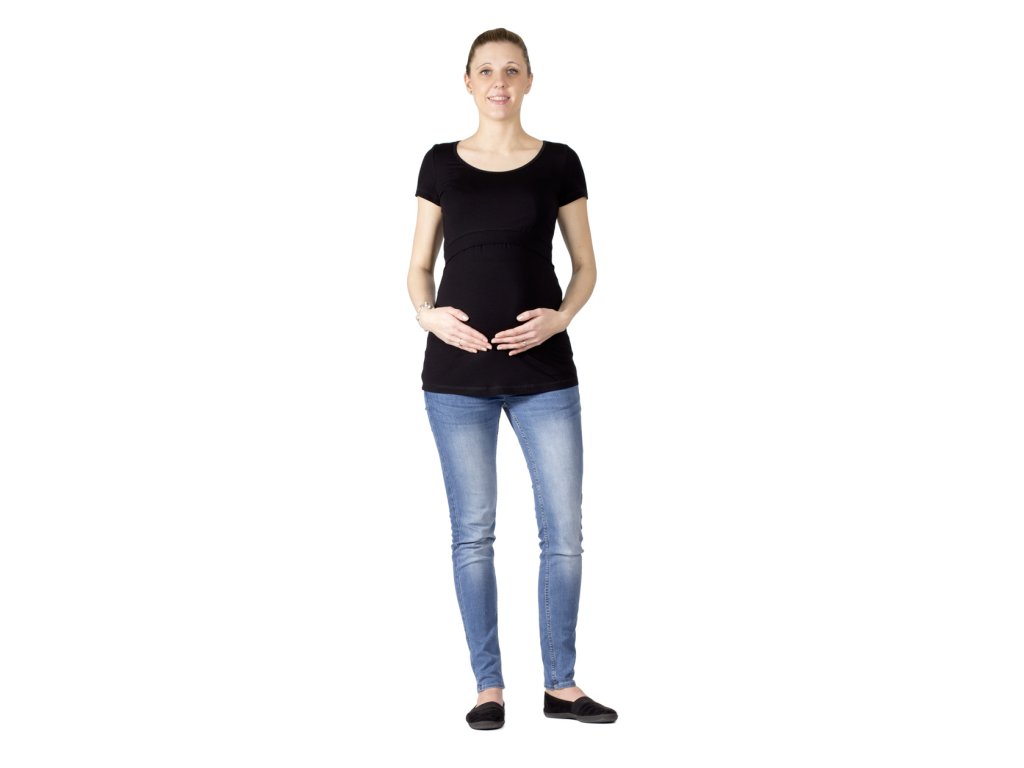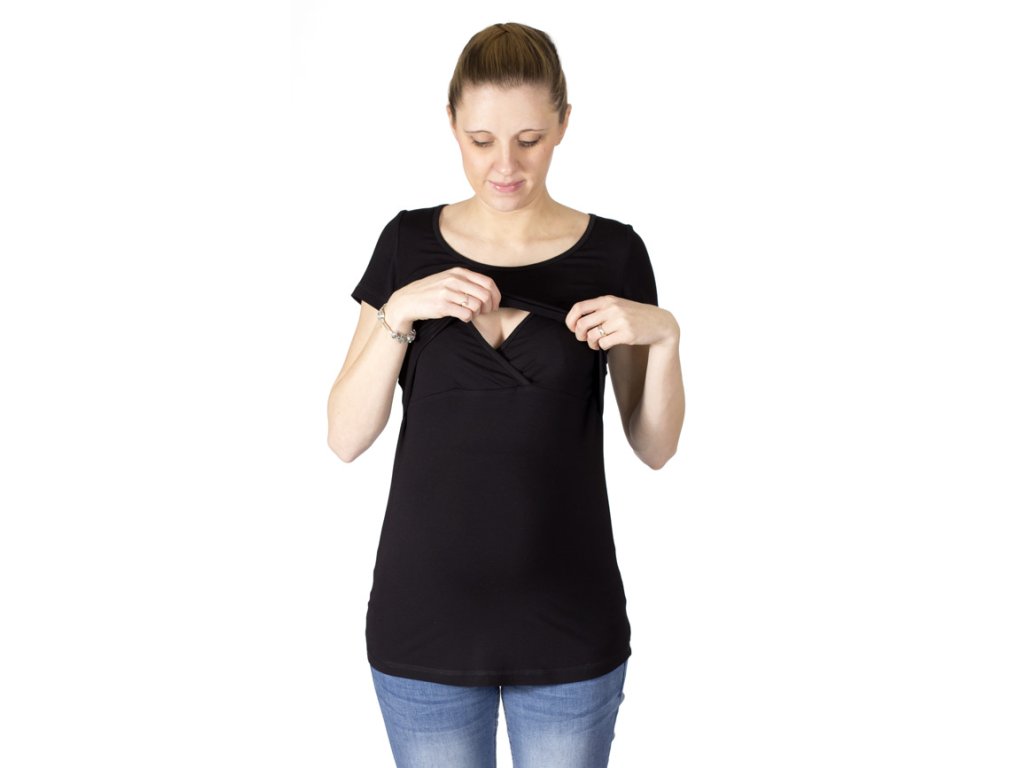 Still- und Umstandsshirt mit großem Rundhalsausschnitt und kurzen Ärmeln. Der Ausschnitt ist unterhalb der Brust. Über den gefalteten (gekreuzten) Stilleinlagen befindet sich ein oberer, diskreter Bereich, der beim Stillen für Privatsphäre sorgt. Dieser Bereich ist mit einem breiteren Saum versehen, sodass er die Figur vorteilhaft betont und nicht aufträgt. Halsausschnitt und Stilleinlagen sind mit Saumstreifen versehen. Der untere Saum des Shirts ist vorne leicht verlängert. Dank des verwendeten Materials ist das Shirt sehr angenehm zu tragen.