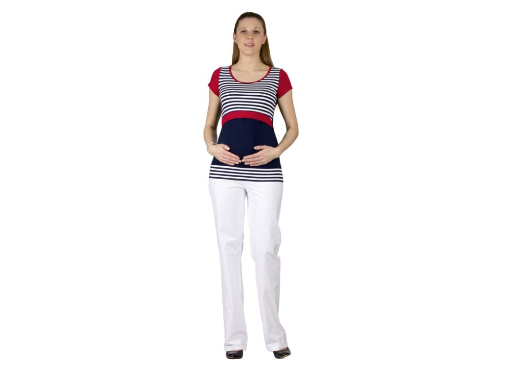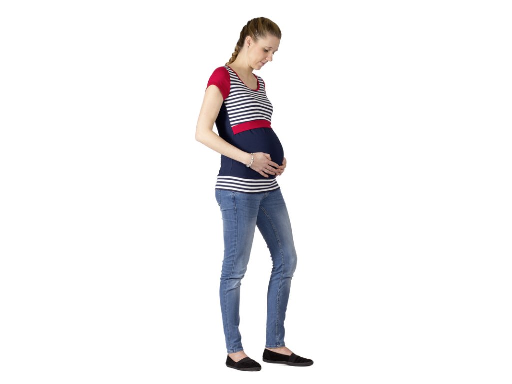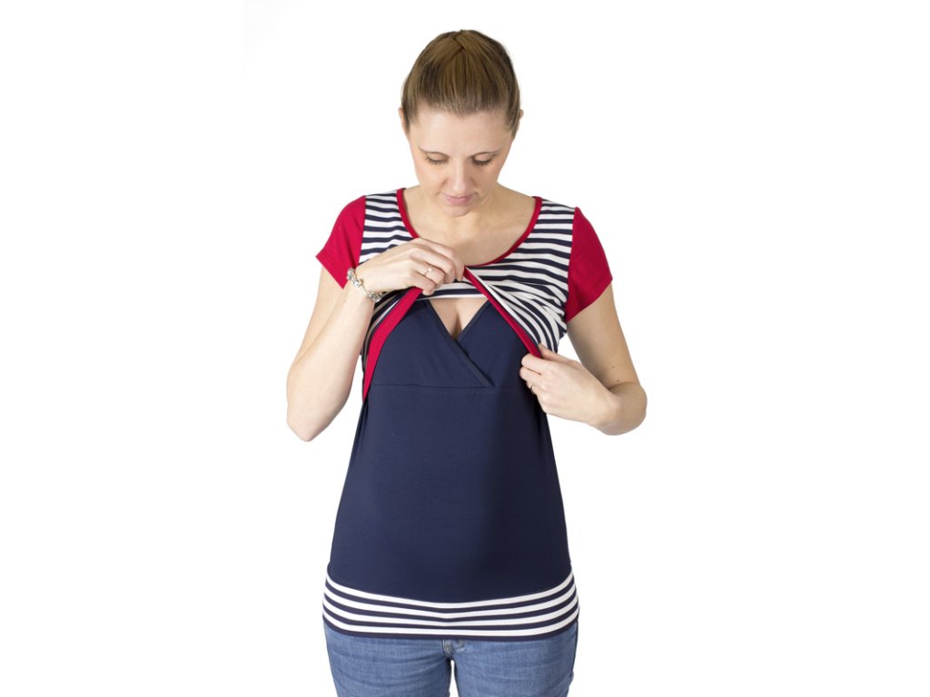 Still- und Umstandsshirt mit lockerem Rundhalsausschnitt und kurzen Ärmeln. Der Ausschnitt ist unterhalb der Brust. Über den gefalteten (gekreuzten) Stilleinlagen befindet sich ein oberer Bereich, der beim Stillen für Privatsphäre sorgt. Dieser Bereich ist mit einem breiteren Saum versehen, sodass er die Figur vorteilhaft betont und nicht aufträgt. Halsausschnitt und Stilleinlagen sind mit Saumstreifen versehen. Der untere Saum des Shirts ist mit einem elastischen Bündchen versehen. Dank des verwendeten Materials ist das Shirt sehr angenehm zu tragen.
