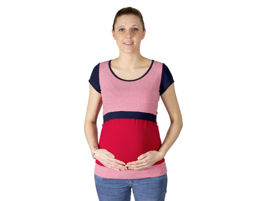 Still- und Umstandsshirt mit lockerem Rundhalsausschnitt und kurzen Ärmeln. Der Ausschnitt ist unterhalb der Brust. Über den gefalteten (gekreuzten) Stilleinlagen befindet sich ein oberer Bereich, der beim Stillen für Privatsphäre sorgt. Dieser Bereich ist mit einem breiteren Saum versehen, sodass er die Figur vorteilhaft betont und nicht aufträgt. Halsausschnitt und Stilleinlagen sind mit Saumstreifen versehen. Der untere Saum des Shirts ist mit einem elastischen Bündchen versehen. Dank des verwendeten Materials ist das Shirt sehr angenehm zu tragen.