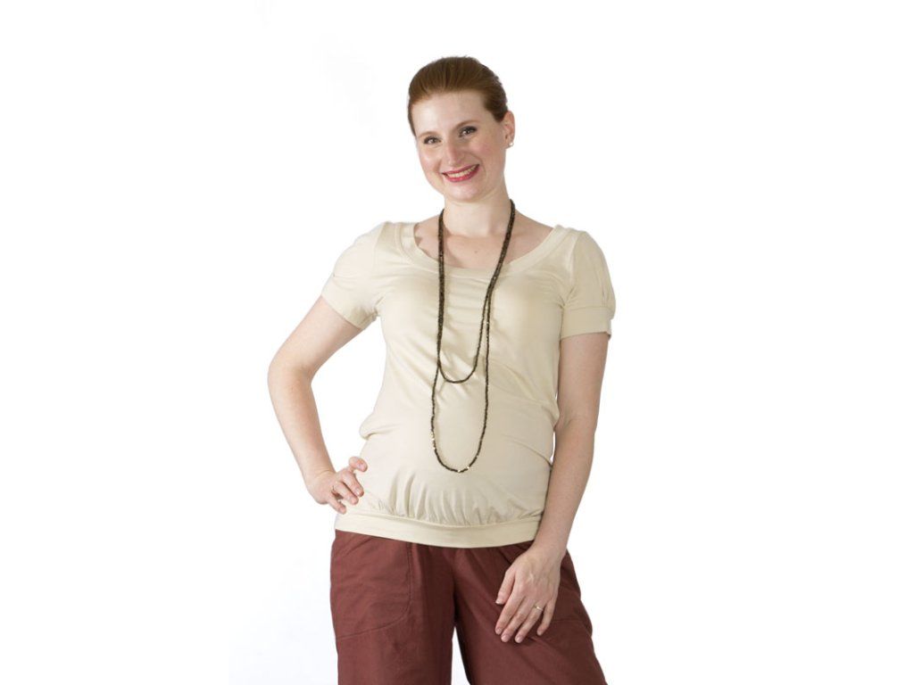Raffung an Ärmeln und Saum. Das Shirt kann auch nach der Schwangerschaft getragen werden.