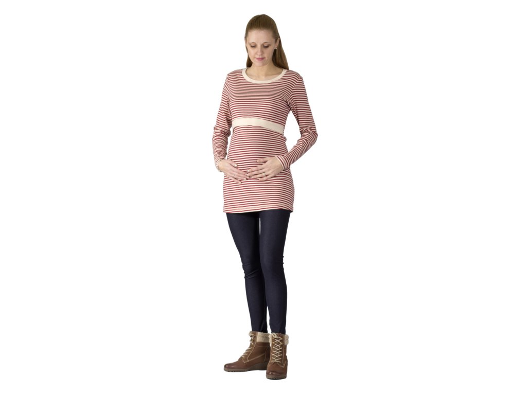 Still- und Umstandsshirt mit kleinem Rundhalsausschnitt und langen Ärmeln. Der Ausschnitt ist unterhalb der Brust. Über den gefalteten (gekreuzten) Stilleinlagen befindet sich ein Oberteil, das beim Stillen für Privatsphäre sorgt. Dieses Oberteil ist mit einem breiteren Saum versehen, sodass es die Figur vorteilhaft umspielt und nicht aufträgt. Ausschnitt und Stilleinlagen sind mit Saumbändern versehen. Dank des verwendeten Materials ist das Shirt sehr angenehm zu tragen. Da der Stoff sehr elastisch ist, wählen Sie im Zweifelsfall lieber eine Nummer kleiner.