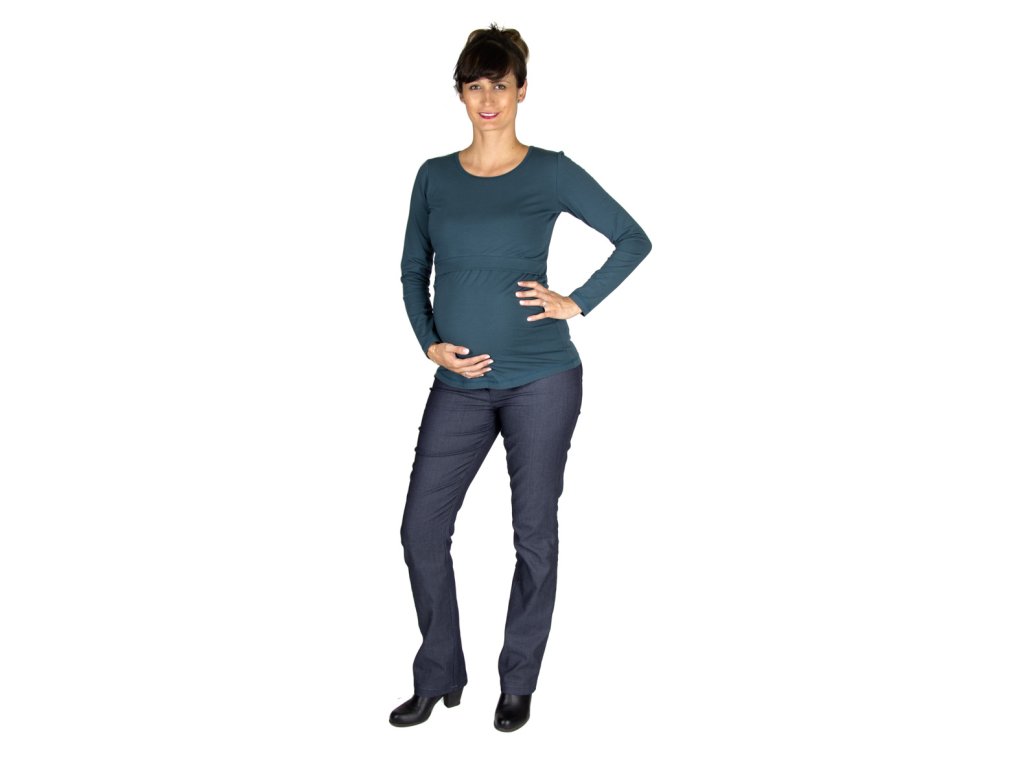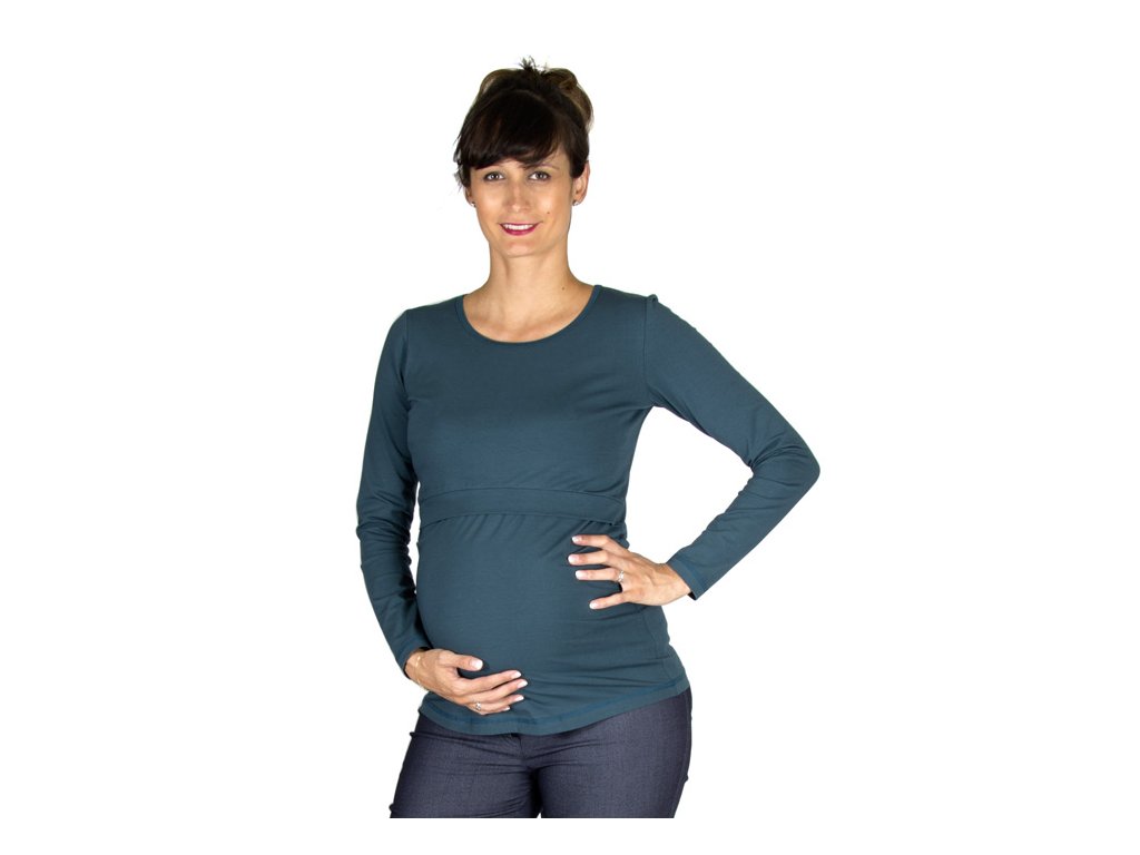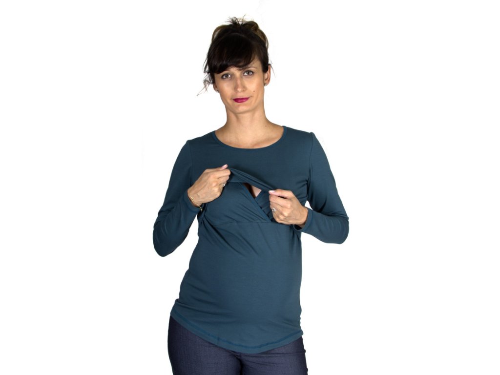 Still- und Umstandsshirt mit kleinem Rundhalsausschnitt und langen Ärmeln. Der Vorderteil ist unterhalb der Brust ausgeschnitten. Über den gefalteten (gekreuzten) Stilleinlagen befindet sich ein Oberteil, das beim Stillen für Privatsphäre sorgt. Dieses Oberteil ist mit einem breiteren Saum versehen, sodass es die Figur vorteilhaft umspielt und nicht aufträgt. Halsausschnitt und Stilleinlagen sind mit Saumbändern versehen. Dank des verwendeten Materials ist das Shirt leicht und sehr angenehm zu tragen.