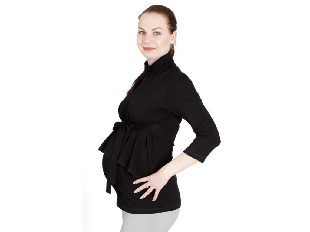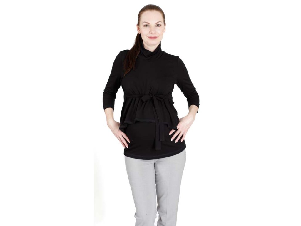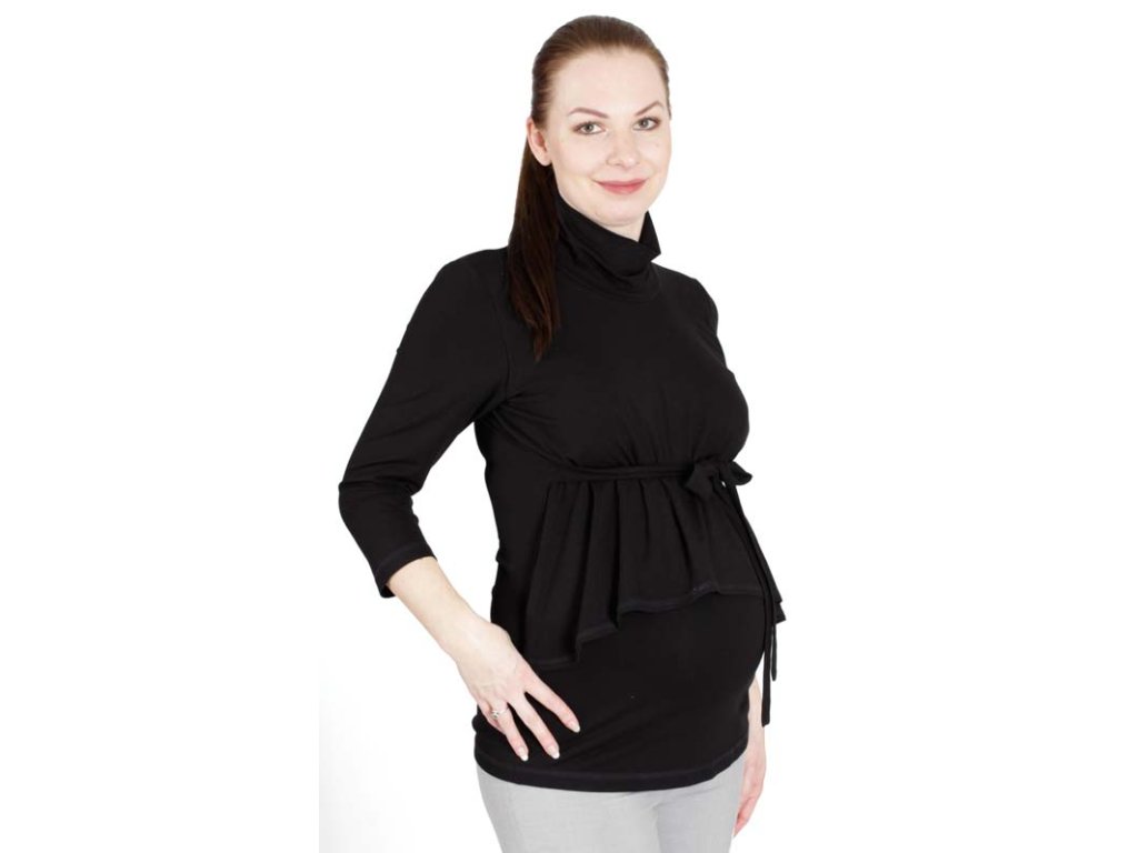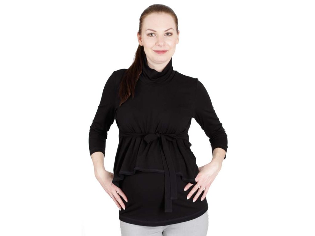 Fantasievolles, elegantes und leicht extravagantes Umstands- und Stillshirt mit lockerem Rollkragen und 3/4-Ärmeln. Dieses Shirt ist perfekt für Frauen, die sowohl im Büro als auch bei verschiedenen Anlässen glänzen möchten. Es ist aus sehr angenehm zu tragendem Viskosematerial gefertigt.