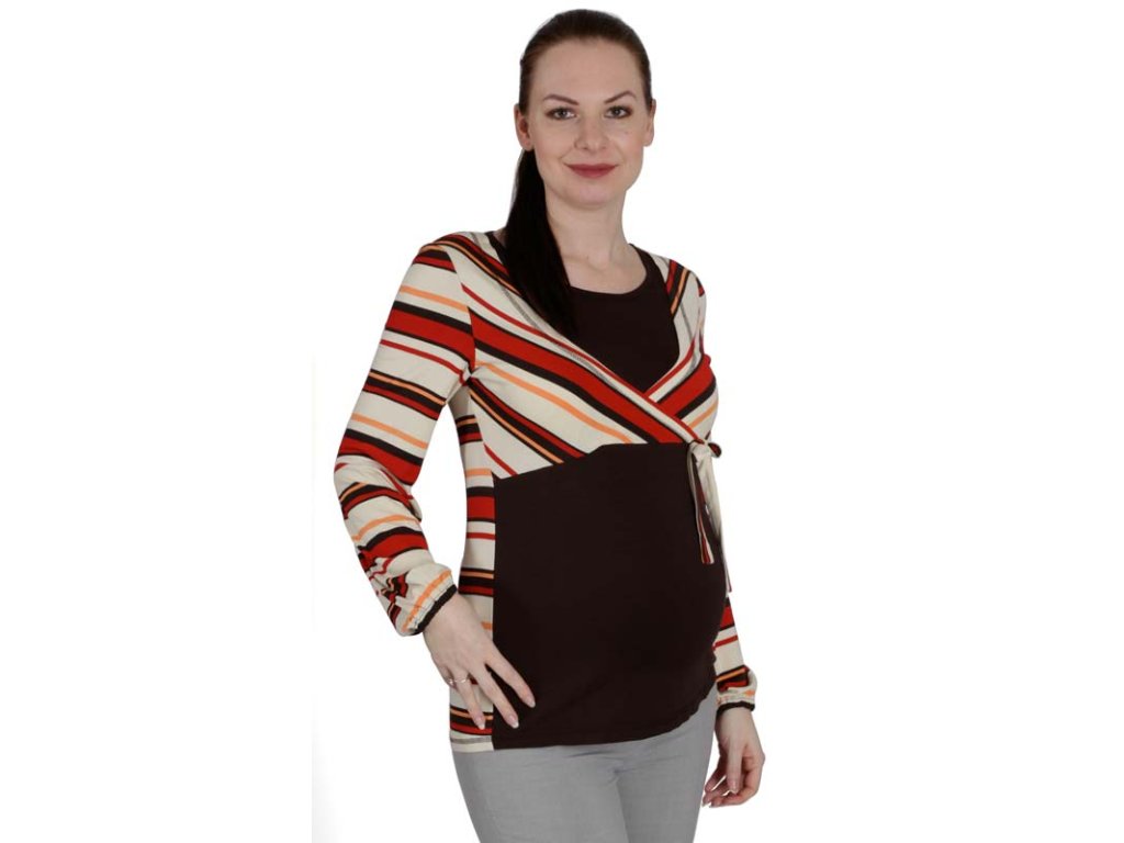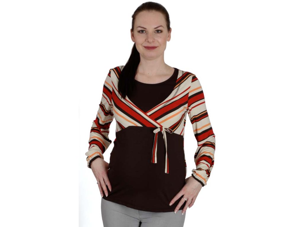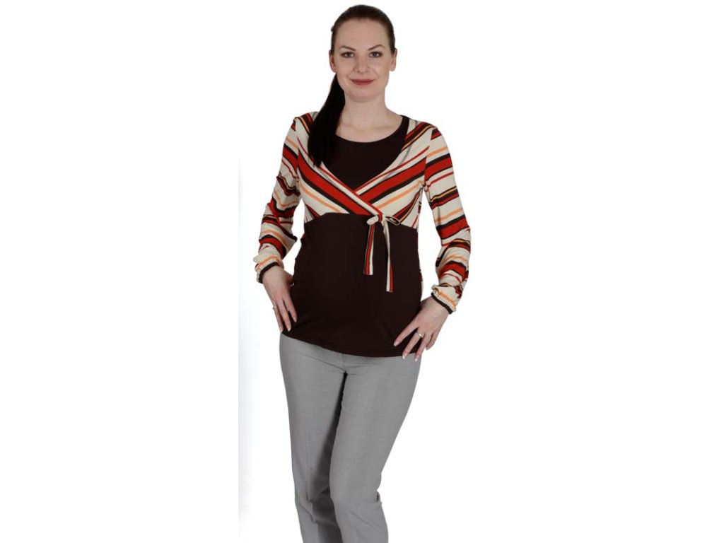 Das Vorderteil ist unterhalb der Brust ausgeschnitten und verfügt über Öffnungen im Oberteil für bequemes Stillen. Durch die Verwendung von kontrastierendem Material an Oberteil und Ärmeln entsteht der Eindruck eines Boleros, der durch eine dekorative Schleife zusätzlich betont wird. Das Rückenteil ist gestreift.