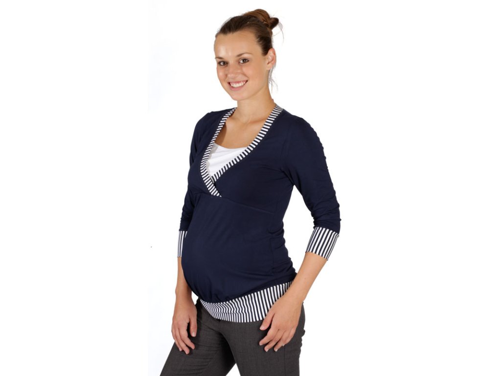 Sehr schönes und bequemes Umstands- und Stillshirt mit 3/4-Ärmeln. Verziert mit einem kontrastierenden Zierstreifen an Ausschnitt, Ärmeln und Saum.