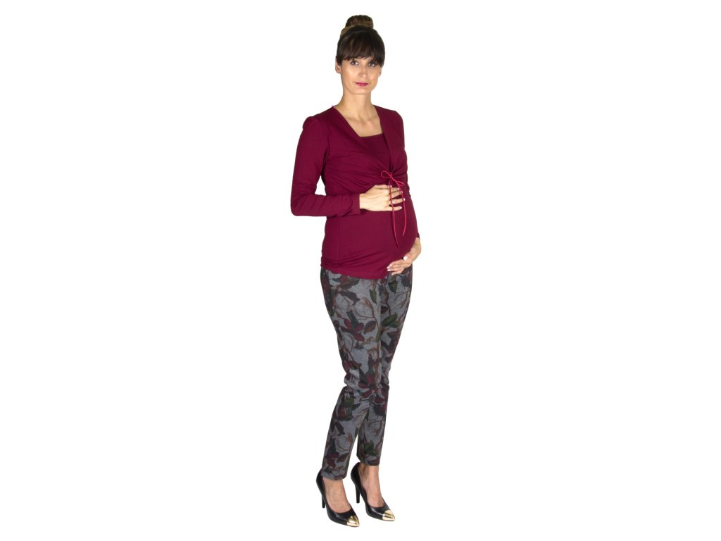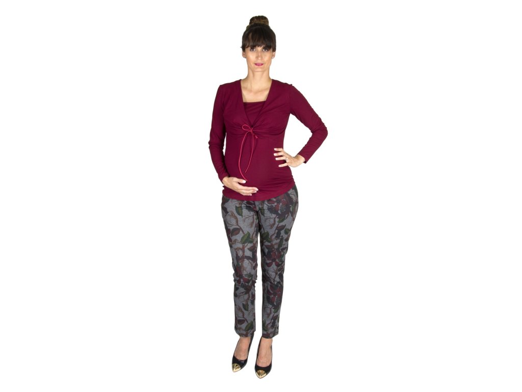 Umstands- und Stillshirt mit langen Ärmeln und praktischem Bindeband am Halsausschnitt. Der Vorderteil ist unterhalb der Brust ausgeschnitten, der untere Teil ist leicht ausgestellt. Das Oberteil ist mit einem Stilleinsatz für bequemes Stillen versehen. Dieser Schnitt eignet sich besonders für Frauen mit größerer Oberweite.