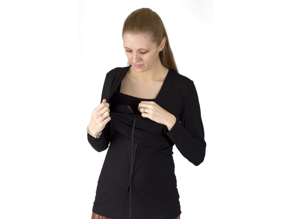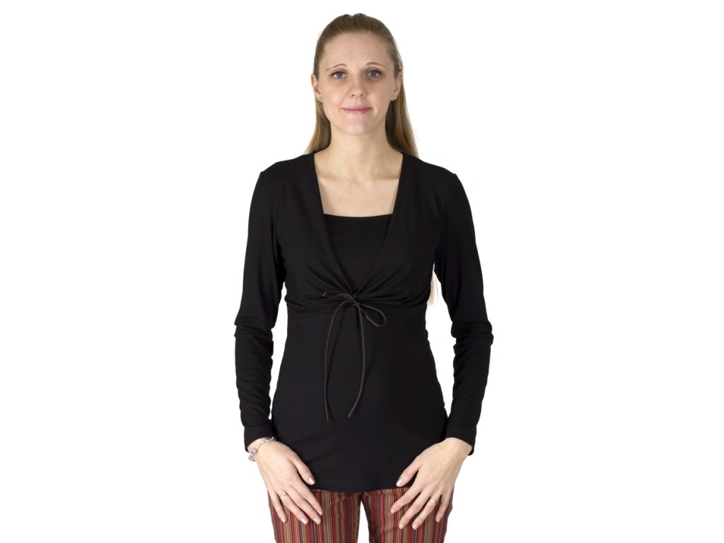 Umstands- und Stillshirt mit langen Ärmeln und praktischem Bindeband am Halsausschnitt. Der Vorderteil ist unterhalb der Brust ausgeschnitten, der untere Teil ist leicht ausgestellt. Das Oberteil ist mit einem Stilleinsatz für bequemes Stillen versehen. Dieser Schnitt eignet sich besonders für Frauen mit größerer Oberweite.