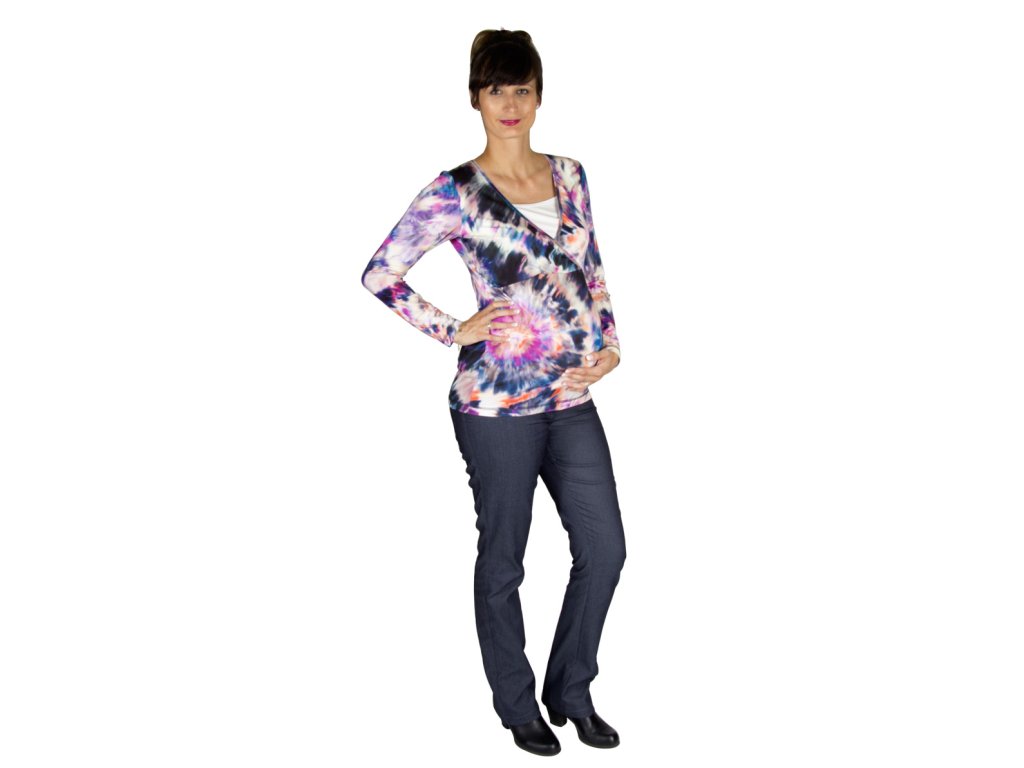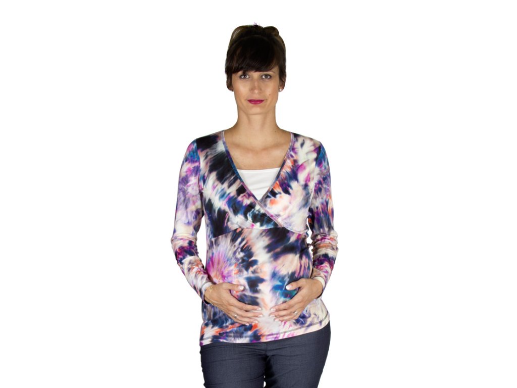 Bequemes, langärmeliges Still-T-Shirt aus Viskose mit Batikmuster. Der gekreuzte Halsausschnitt wird durch ein Innenteil mit praktischen Öffnungen zum einfachen Stillen ergänzt. Der leicht ausgestellte Saum bietet dank des elastischen Materials viel Platz für den Bauch. Die Vorderseite ist leicht verlängert. Durch die Farben und den Digitaldruck passt das T-Shirt zu fast allen Hosen und Röcken und eignet sich sowohl für den Alltag als auch für die Freizeit.