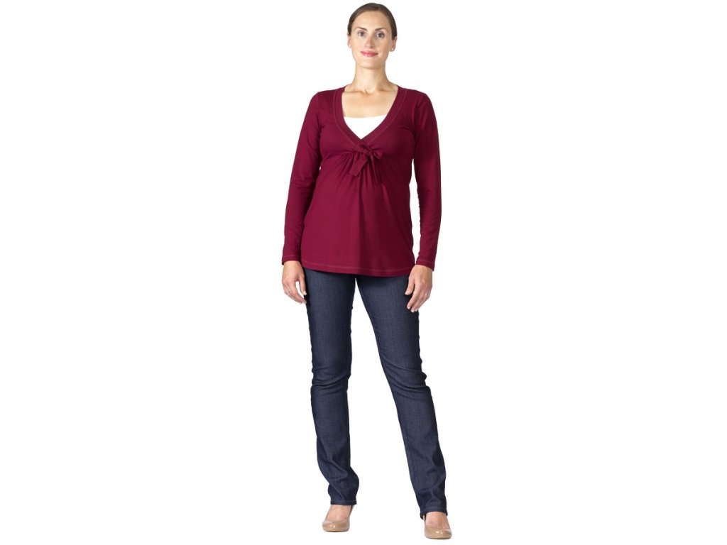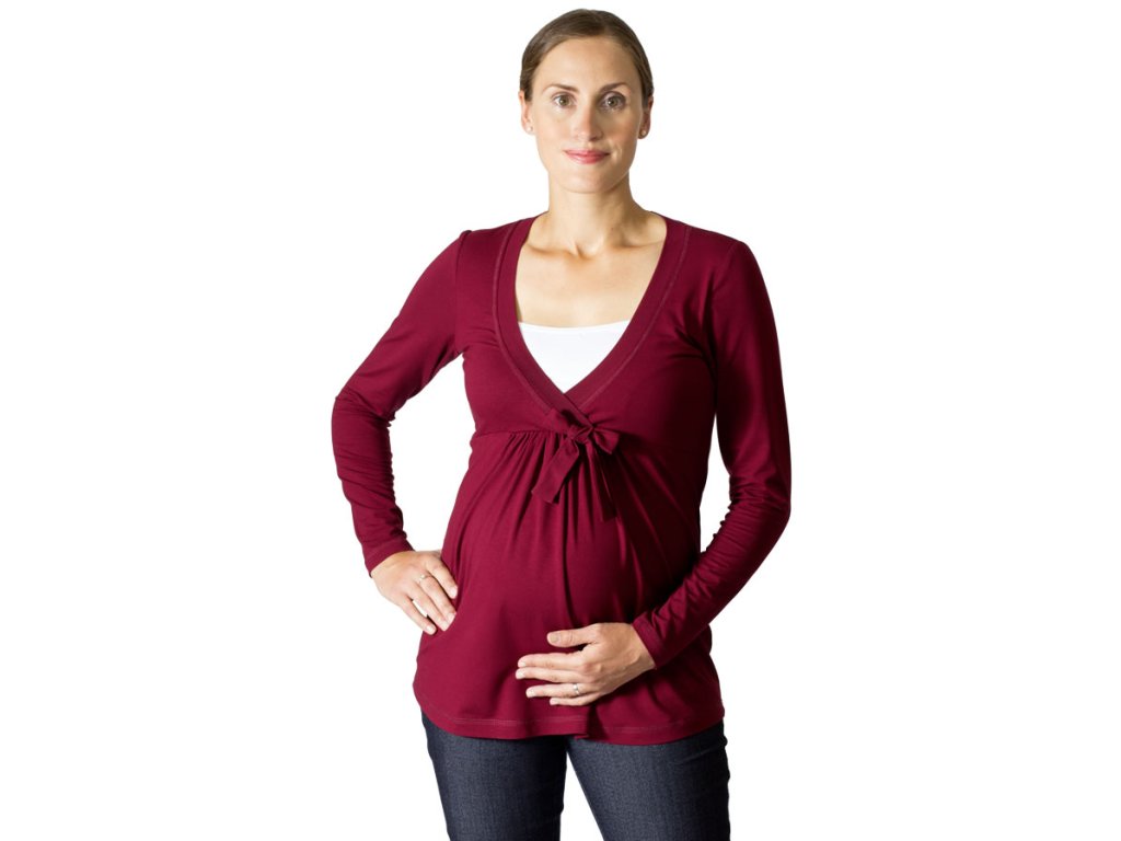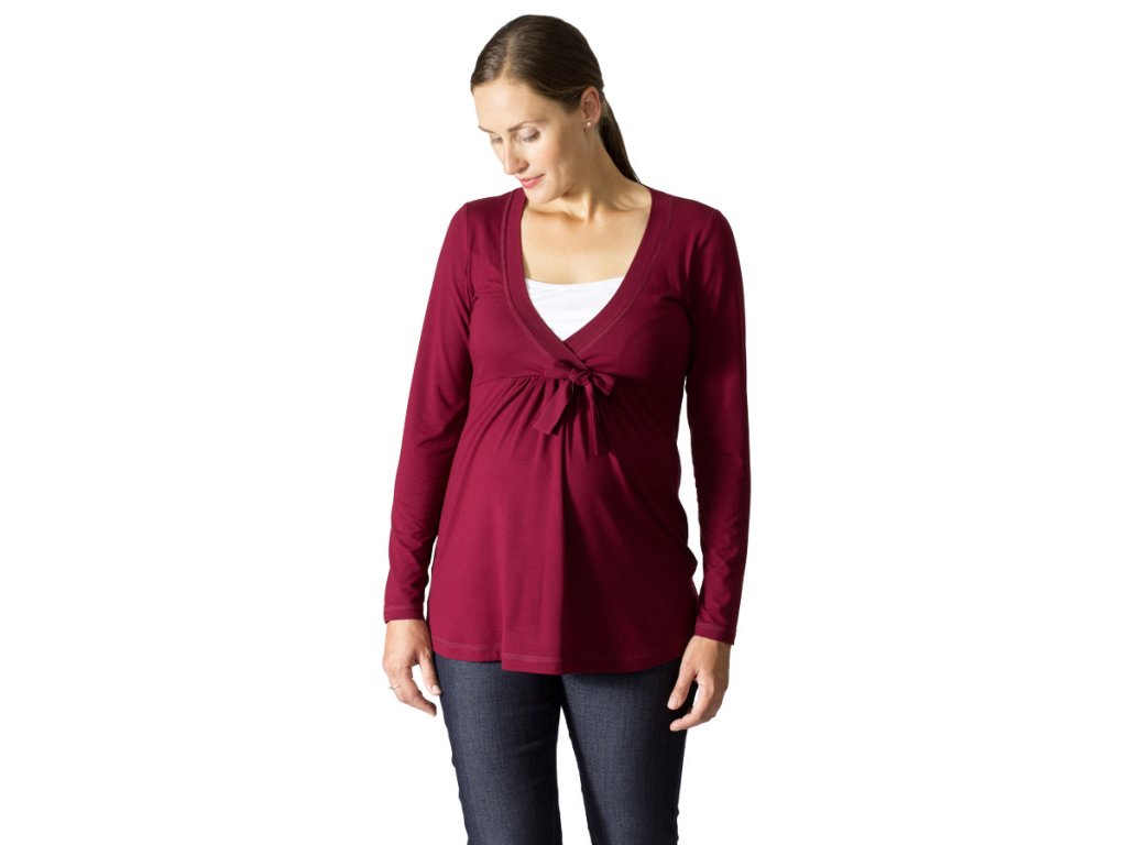 Sehr angenehmes und bequemes Still- und Umstandsshirt mit Stilleinsatz und weitem Halsausschnitt mit Bindeband. Es hat eine A-Linien-Silhouette mit leicht verlängerter Vorderseite und langen Ärmeln. Der untere Teil der Vorderseite ist unterhalb der Brust am Bauch gerafft. Das Shirt ist aus angenehm kühlender Viskose gefertigt, einem Naturmaterial aus Holz.