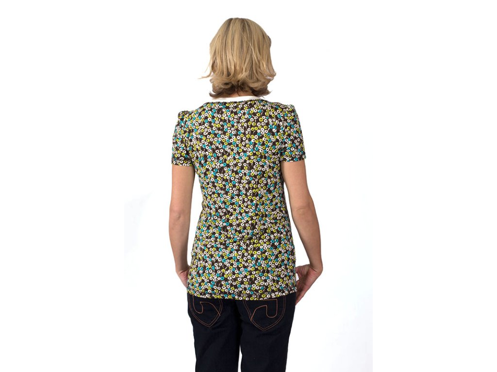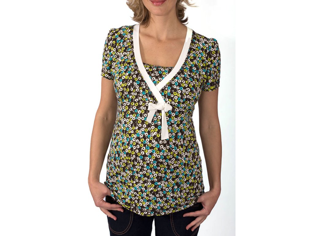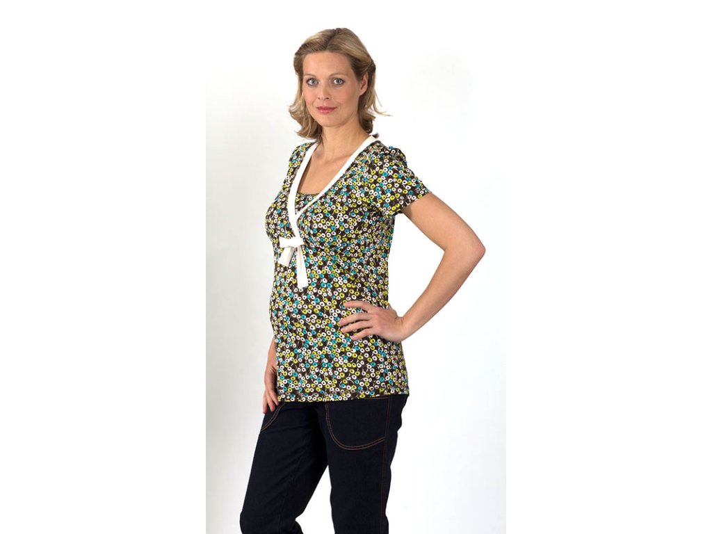 Sehr schönes, bequemes Umstands- und Stillshirt mit weitem Halsausschnitt und Bindeband. Es hat eine A-Linien-Silhouette mit leicht verlängerter Vorderseite und leicht gerafften kurzen Ärmeln. Das Oberteil ist im unteren Bereich unterhalb der Brust gerafft und mit einem Stilleinsatz für bequemes Stillen versehen. Es ist aus angenehm kühlender Viskose gefertigt, einem Naturmaterial, das aus Holz gewonnen wird.