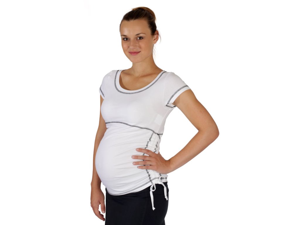 Umstandsshirt mit Rundhalsausschnitt und kurzen Ärmeln. Der PD-Ausschnitt befindet sich unterhalb der Brust. Ein eingenähter Kordelzug an den Seitennähten sorgt für optimale Bewegungsfreiheit am Bauch.