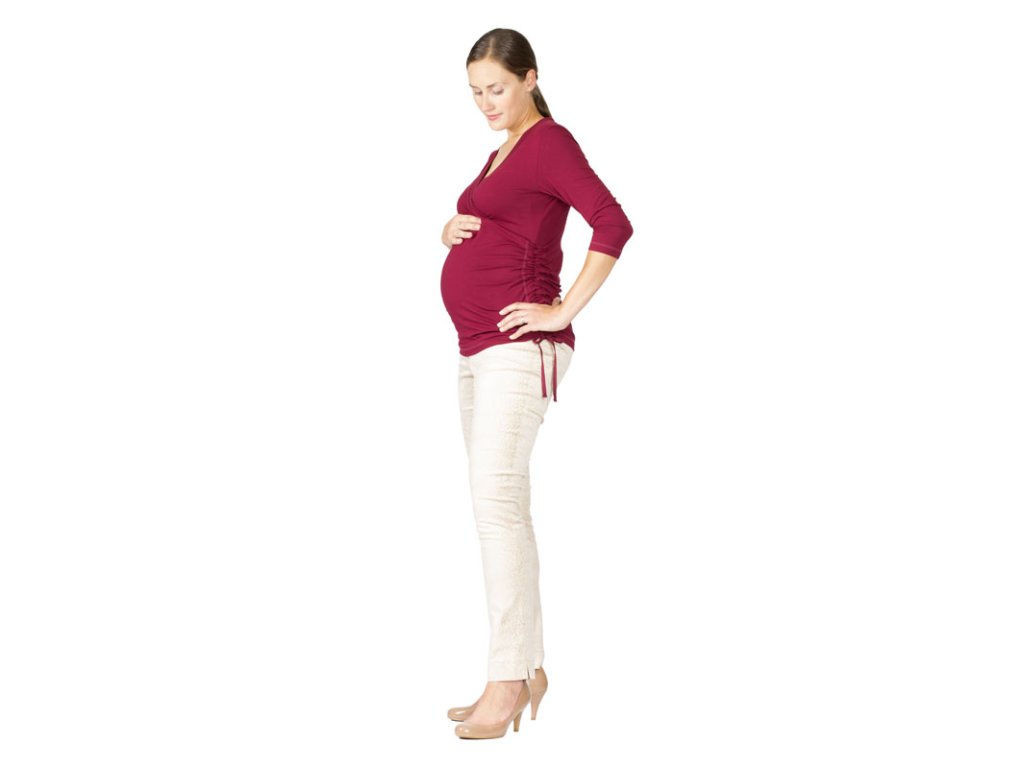 Sehr bequemes Umstands- und Stillshirt mit überkreuztem V-Ausschnitt und 3/4-Ärmeln. Der Schnitt ist vorne und hinten unterhalb der Brust geschnitten und hat einen Kordelzug am Saum. Die Länge und der Raffungsgrad lassen sich durch Ziehen an den Bändern individuell anpassen.