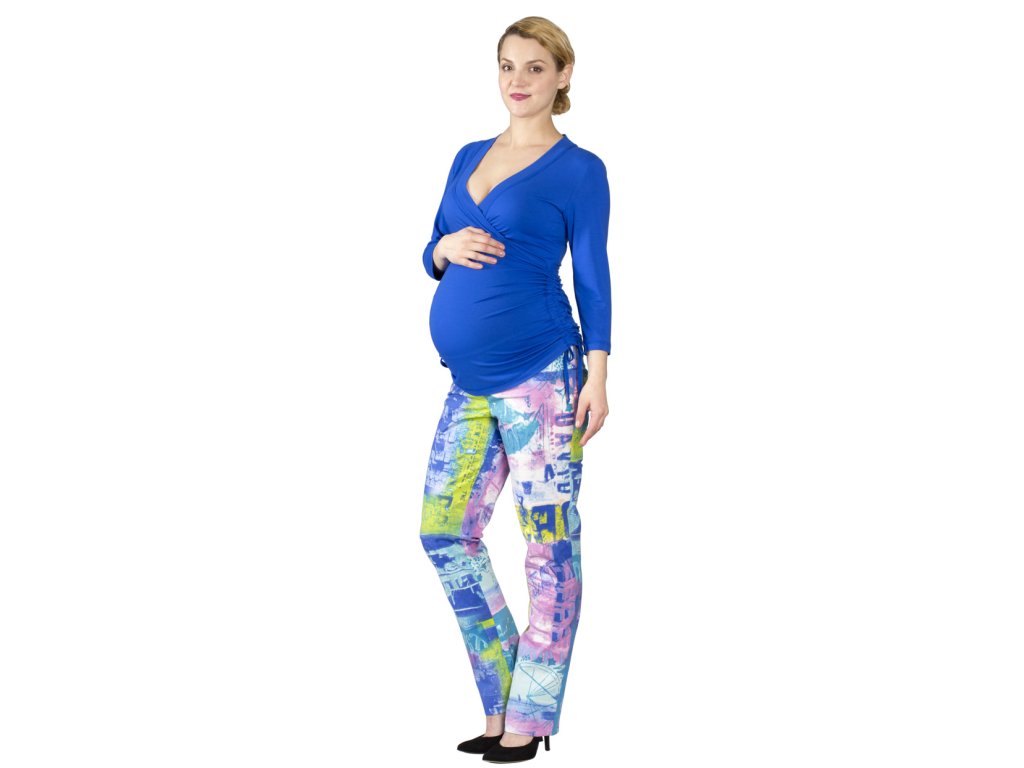 Sehr bequemes Umstands- und Stillshirt mit überkreuztem V-Ausschnitt und 3/4-Ärmeln. Der Schnitt ist vorne und hinten unterhalb der Brust geschnitten und hat einen Kordelzug am Saum. Die Länge und der Raffungsgrad lassen sich durch Ziehen an den Bändern individuell anpassen.