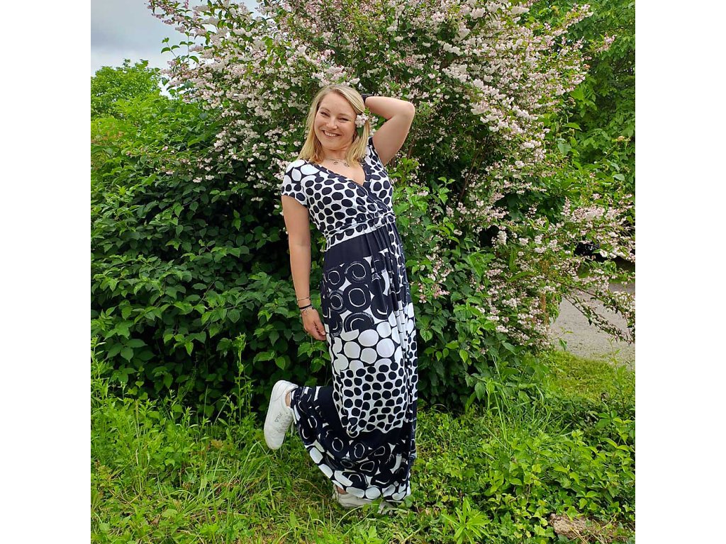 Elegantes Sommer-Umstandskleid aus sehr bequemem, elastischem Material mit V-Ausschnitt. Dank des umgeschlagenen Oberteils ist bequemes Stillen gewährleistet. Das Kleid hat kurze Ärmel, das Vorderteil ist unterhalb der Brust geschnitten und der Rockteil ist gerafft, was dem wachsenden Bauch Freiraum gibt. Das Kleid eignet sich für Arbeit und Freizeit. Es kann nicht nur während der Schwangerschaft getragen werden, sondern auch nach der Geburt, wenn Ihre Figur allmählich ihre ursprünglichen Proportionen wiedererlangt.
